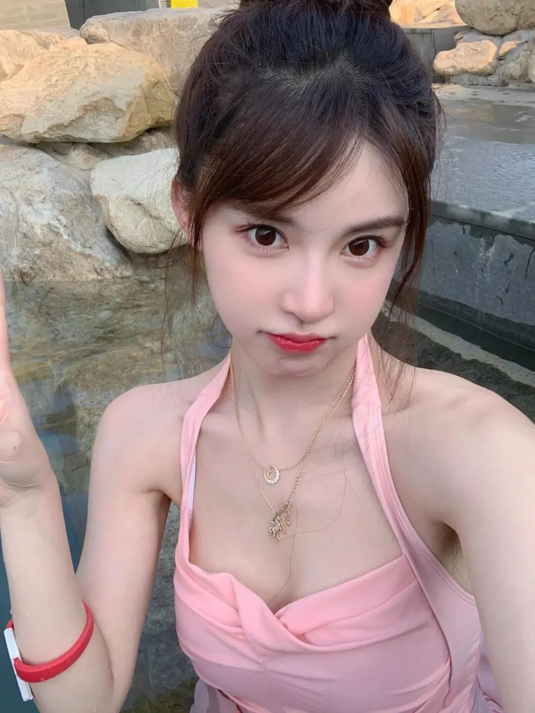 上周去泡户外温泉,最崩溃的不是水温,是一坐进池子里就不知道手往哪放。旁边全是石头、水面、阳光,本来以为随便拍都很有氛围,结果第一轮照片看下来,肩膀缩着、脖子没了,粉色泳衣也被拍得有点皱巴巴。后来我发现,温泉照想拍得自然,不是动作多复杂,而是让身体有支点,表情别太用力