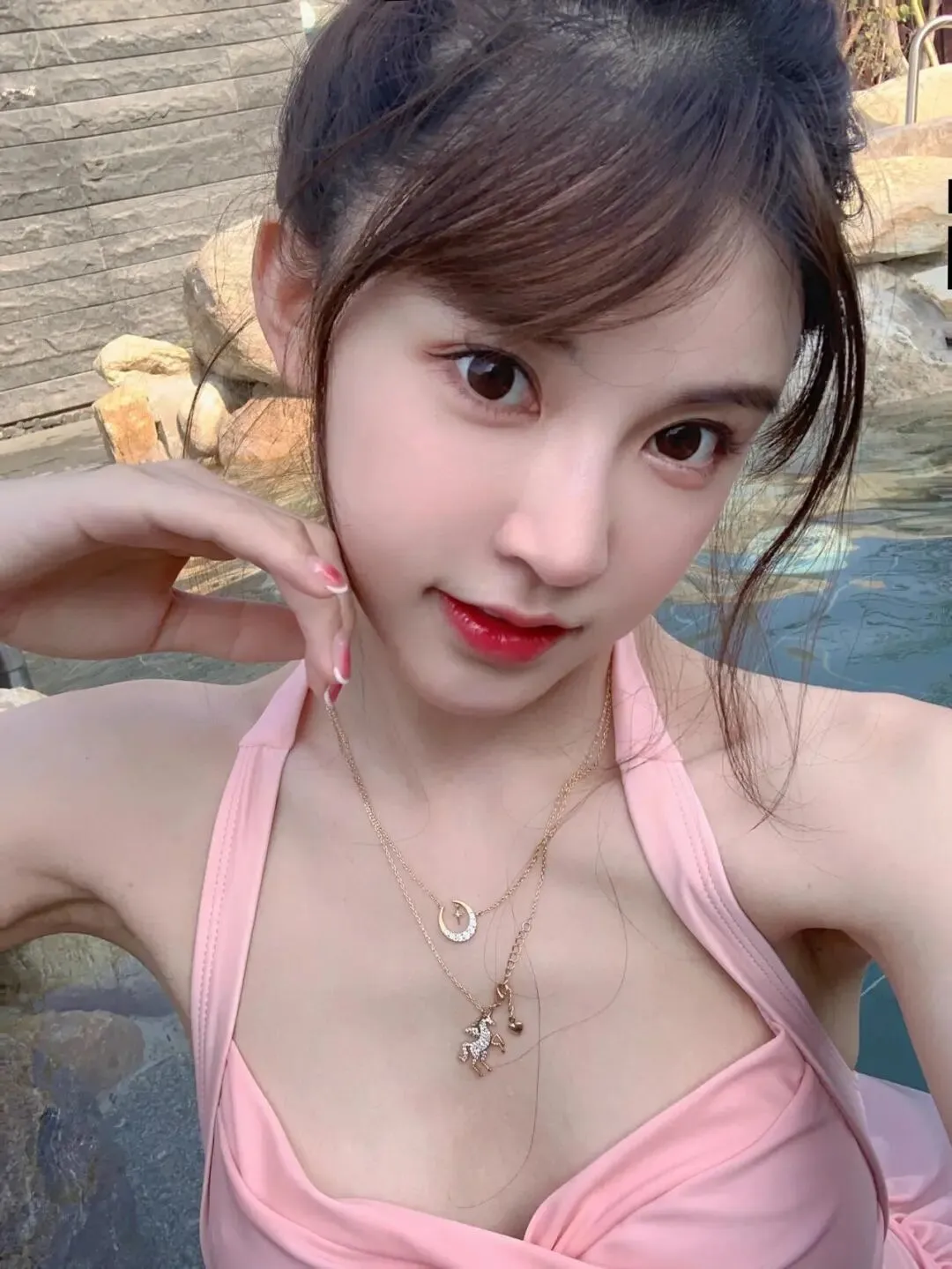 还有个细节我很喜欢:金色项链在粉色泳衣上很提气。不是那种夸张的闪,而是细细一层,把上半身的空白接住了。泳池、温泉这种场景,配饰小一点反而更精致