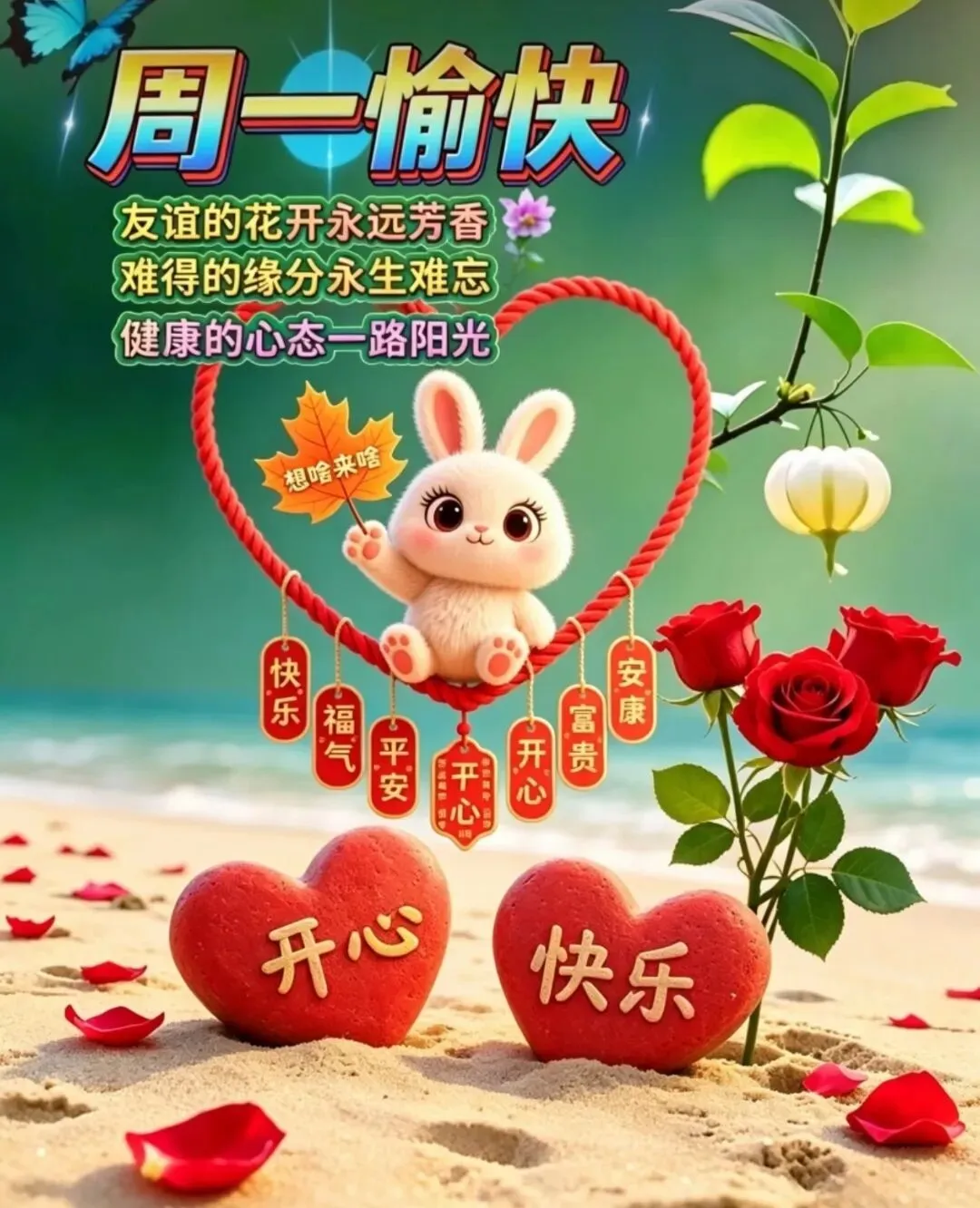 🌈问候中,伴随平平安安,💝祝福中,又迎来新的一天!🌹祝福,是一束美丽的鲜花;🌸牵挂,是一种情感的升华,🌊愿喜乐平安如意!周一早上好!🌅