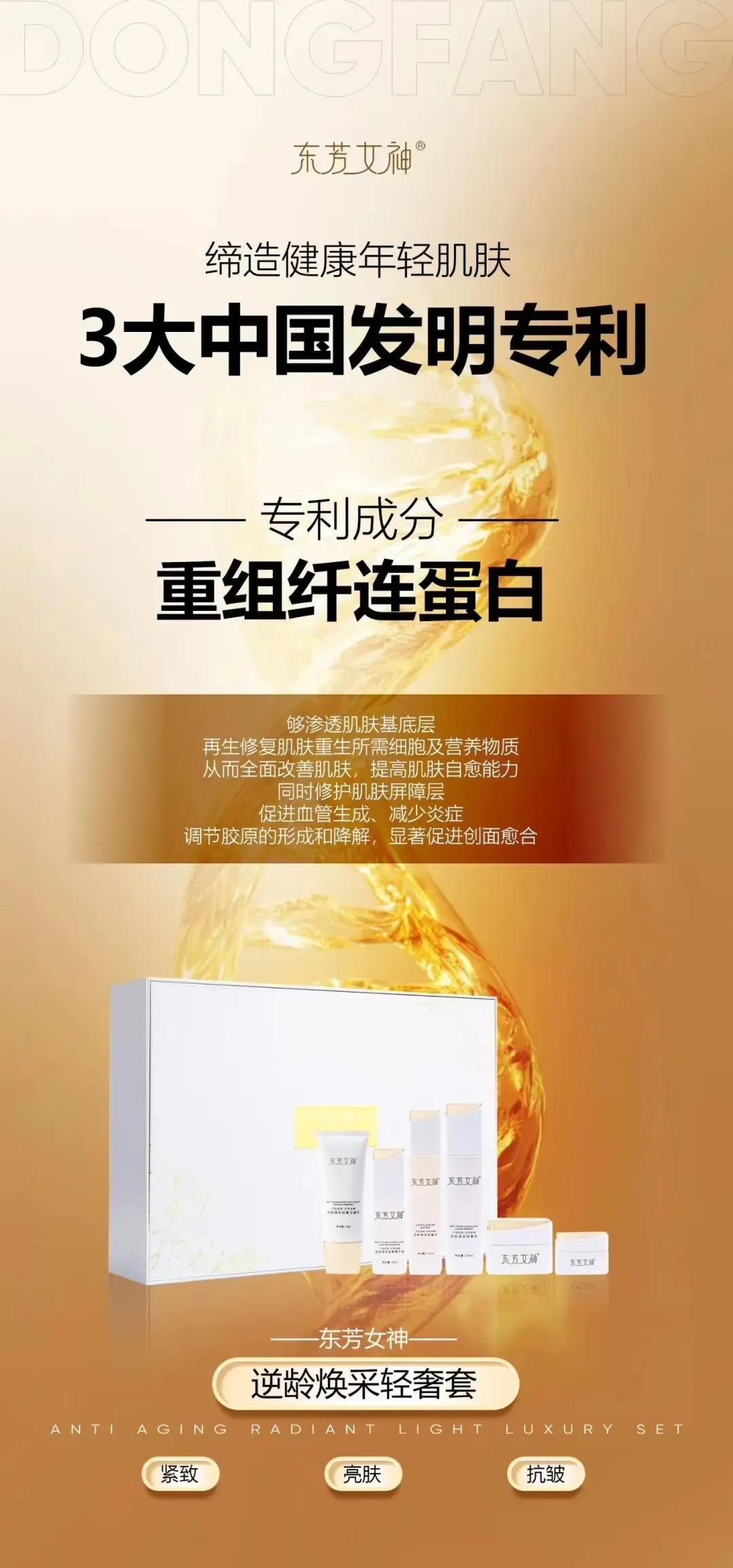 东芳女神逆龄焕采轻奢套以 “缔造健康年轻肌肤” 为核心定位,依托 3 大中国发明专利与重组纤连蛋白核心成分,一站式解决肌肤松弛、暗沉、细纹、屏障受损等问题,实现紧致、亮肤、抗皱多效合一,打造健康年轻的逆龄美肌。