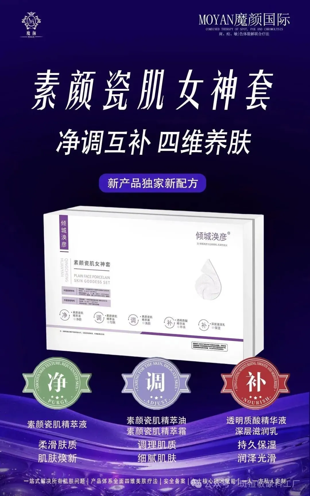 倾城涣颜素颜瓷肌女神套,以「净→调→补→固」四维递进,层层净化、调理肤质、深润保湿、强韧屏障,温和打造透亮瓷肌、素颜女神感。