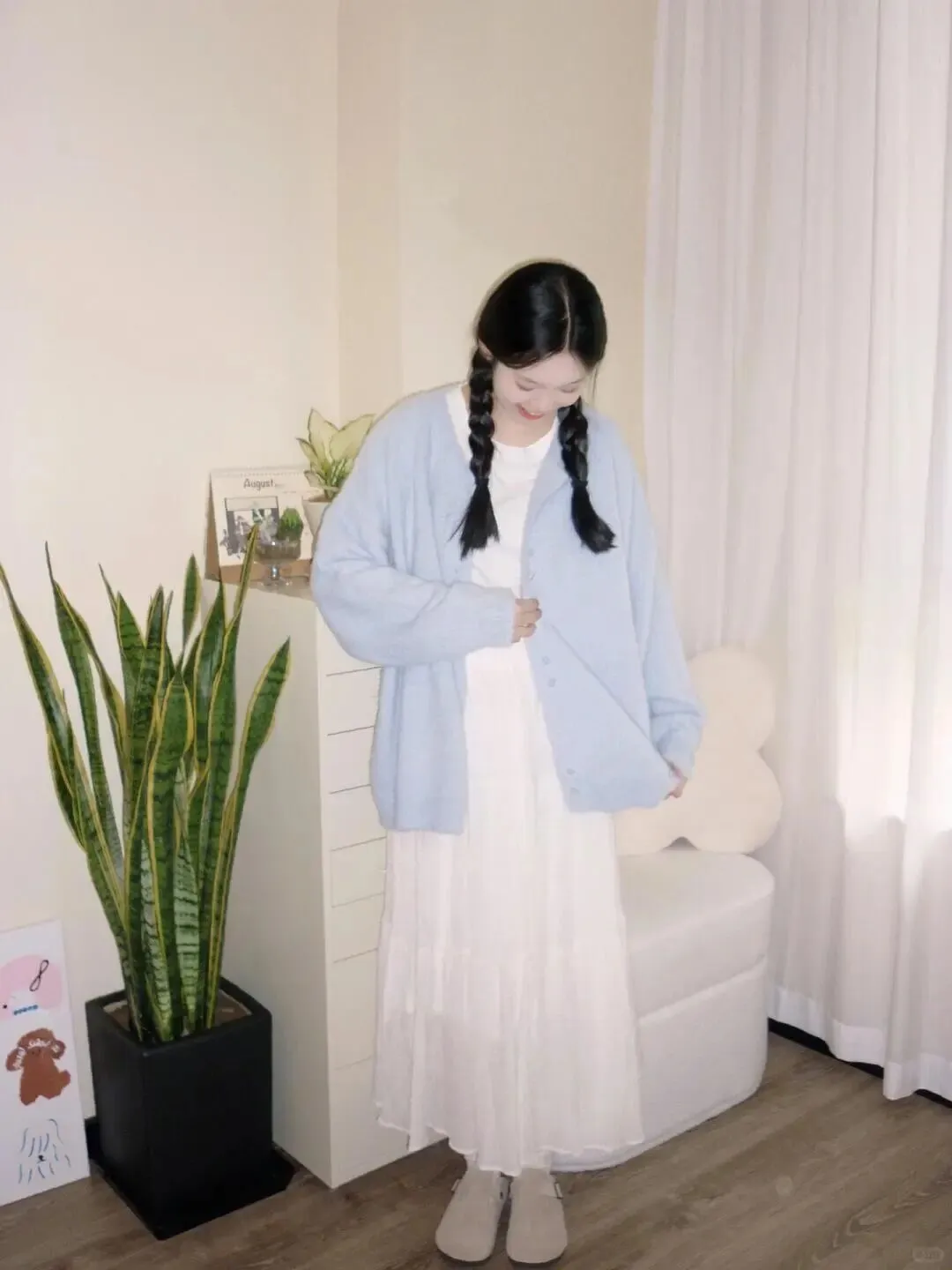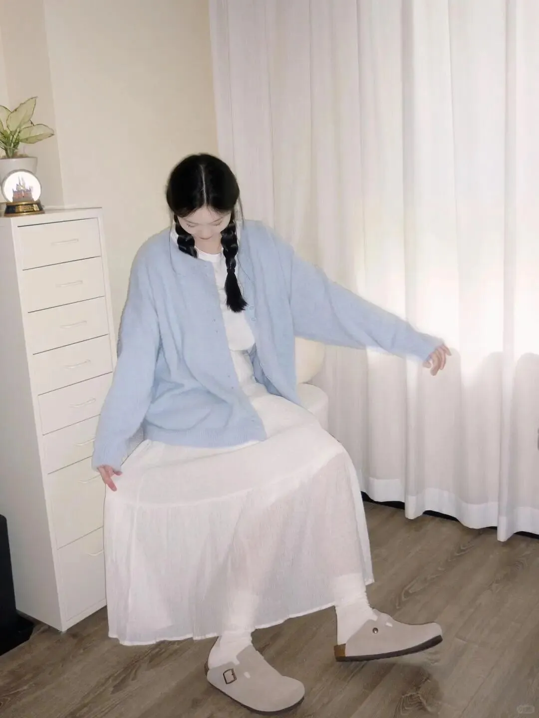 拍照好不好看,穿搭占了七分。春天就别穿得太厚重了,像图里这种浅蓝色针织开衫,内搭白色 T 恤,下半身配上飘逸的白色长裙,整体色调干净又清爽。蓝色对黄皮姐妹非常友好, **显白效果一绝** ,而且浅色系在家里拍摄会显得空间更明亮。切记不要穿全身黑或者花纹太复杂的衣服,那样会抢了人物的风头。头发可以编成两个麻花辫,瞬间减龄,那种邻家妹妹的亲切感立马就出来了,这才是春日写真的正确打开方式。
