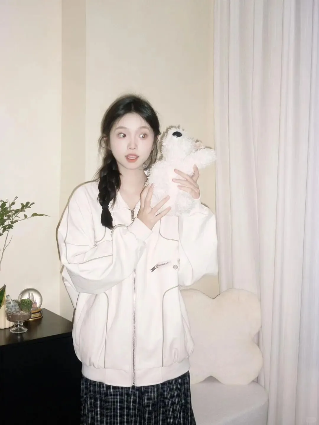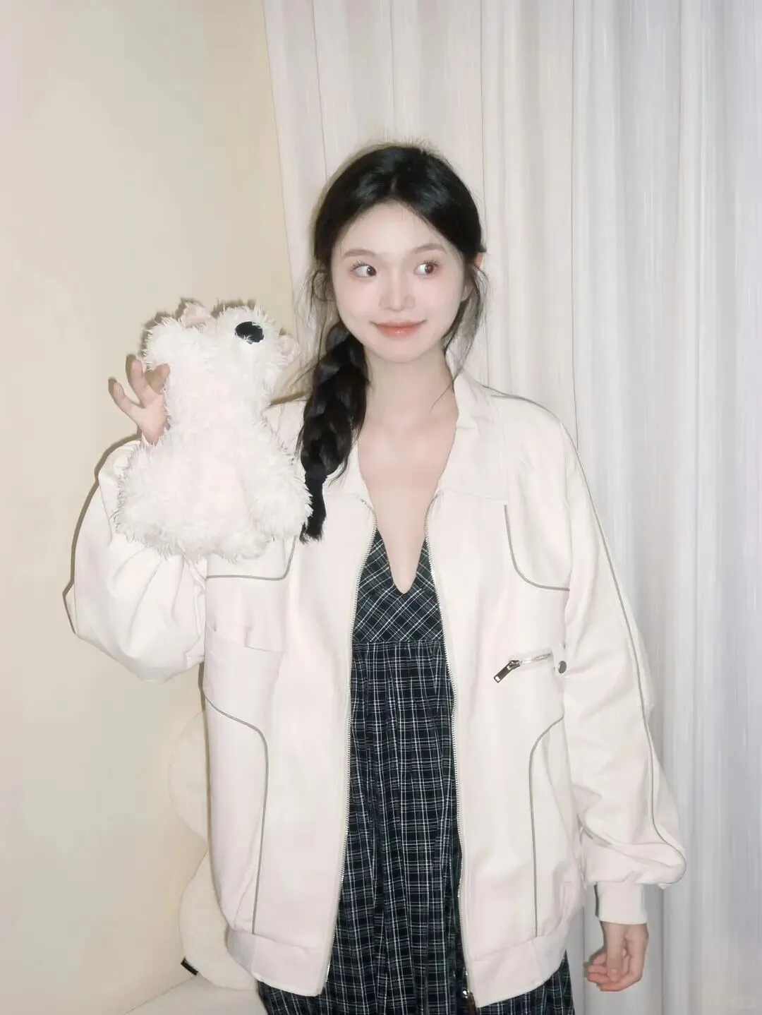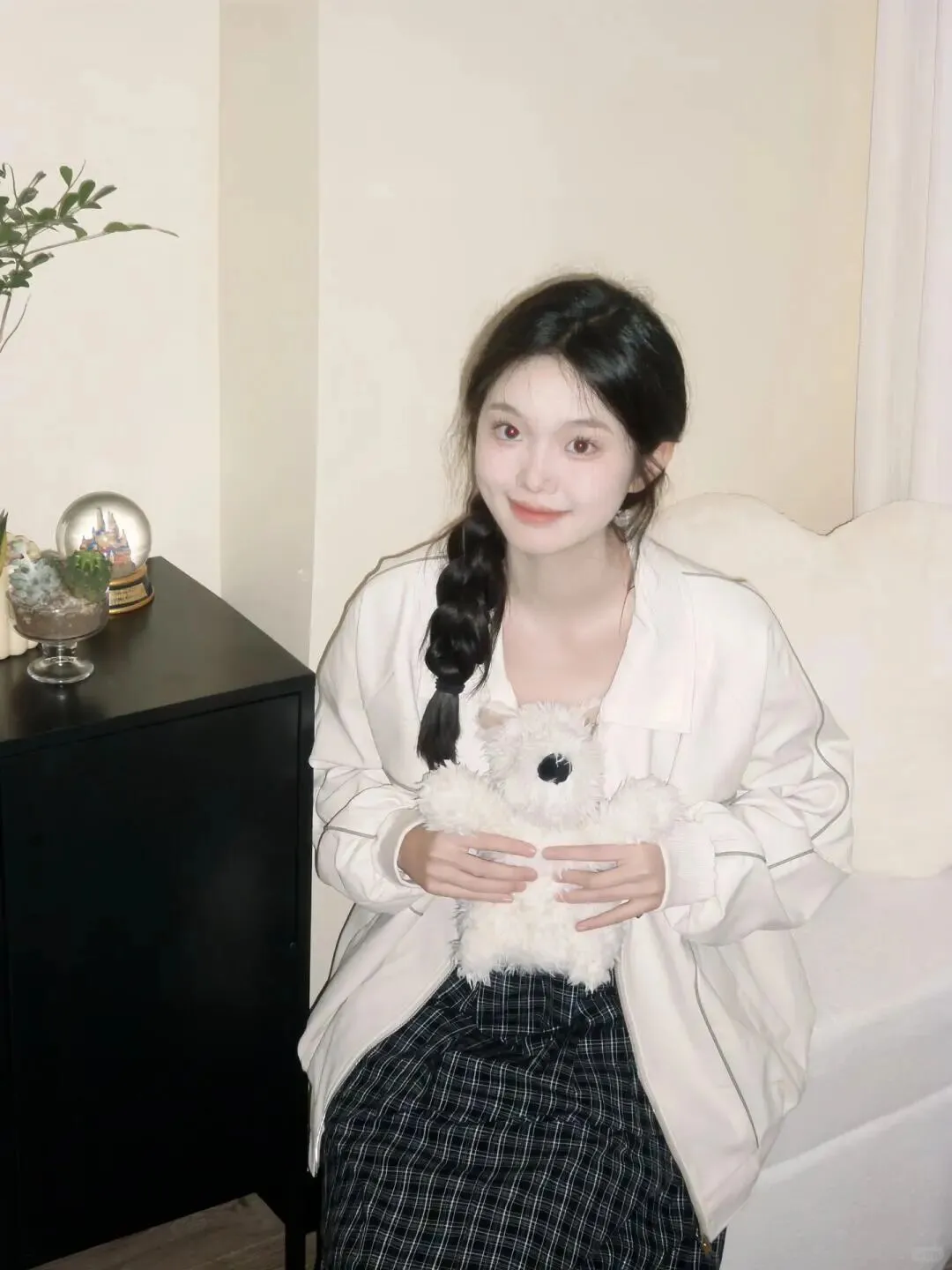 春天总是让人想要记录下来,但有时候天气多变,或者单纯不想出门挤景点,这时候居家拍照就成了最舒服的选择。很多姐妹觉得在家里背景太简单,拍出来像证件照,其实只要掌握几个小技巧,自家客厅也能拍出杂志大片感。今天分享的这组照片,就是典型的居家氛围感写真,不需要复杂的布景,一件白色外套搭配格子裙,再加上一只毛绒玩偶,轻松拿捏温柔甜妹风。