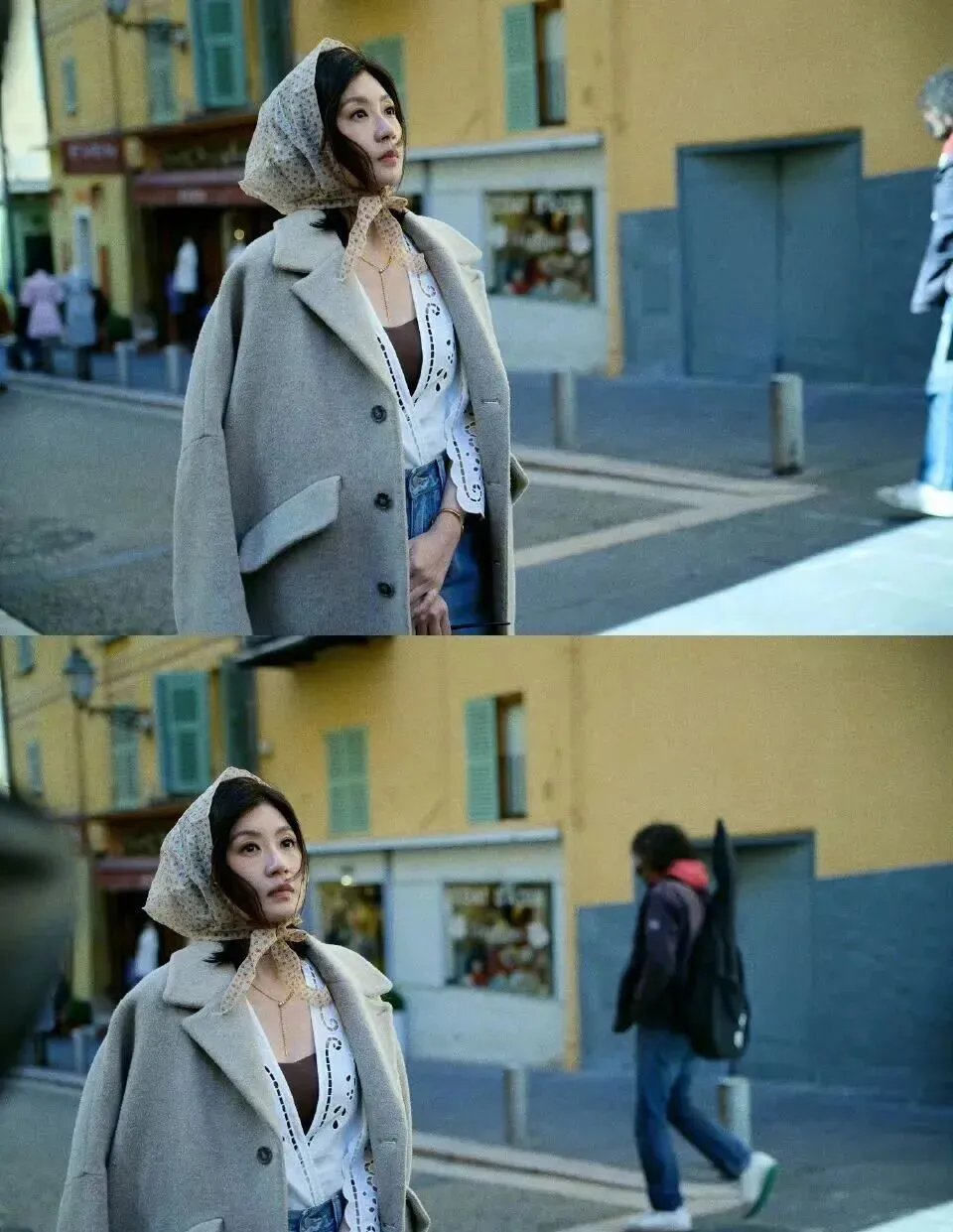 贾静雯的搭配稍有些繁复,内搭+头巾+大衣,元素比较多。另外把衣服塞进裤子里破坏了这件上衣的整体性,也让人忽略了本身上衣有细腰带的设计。