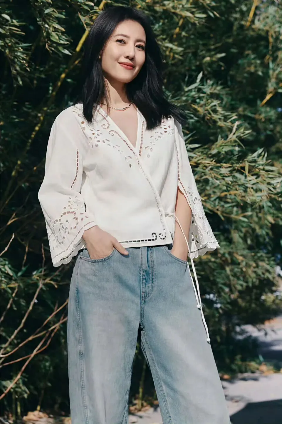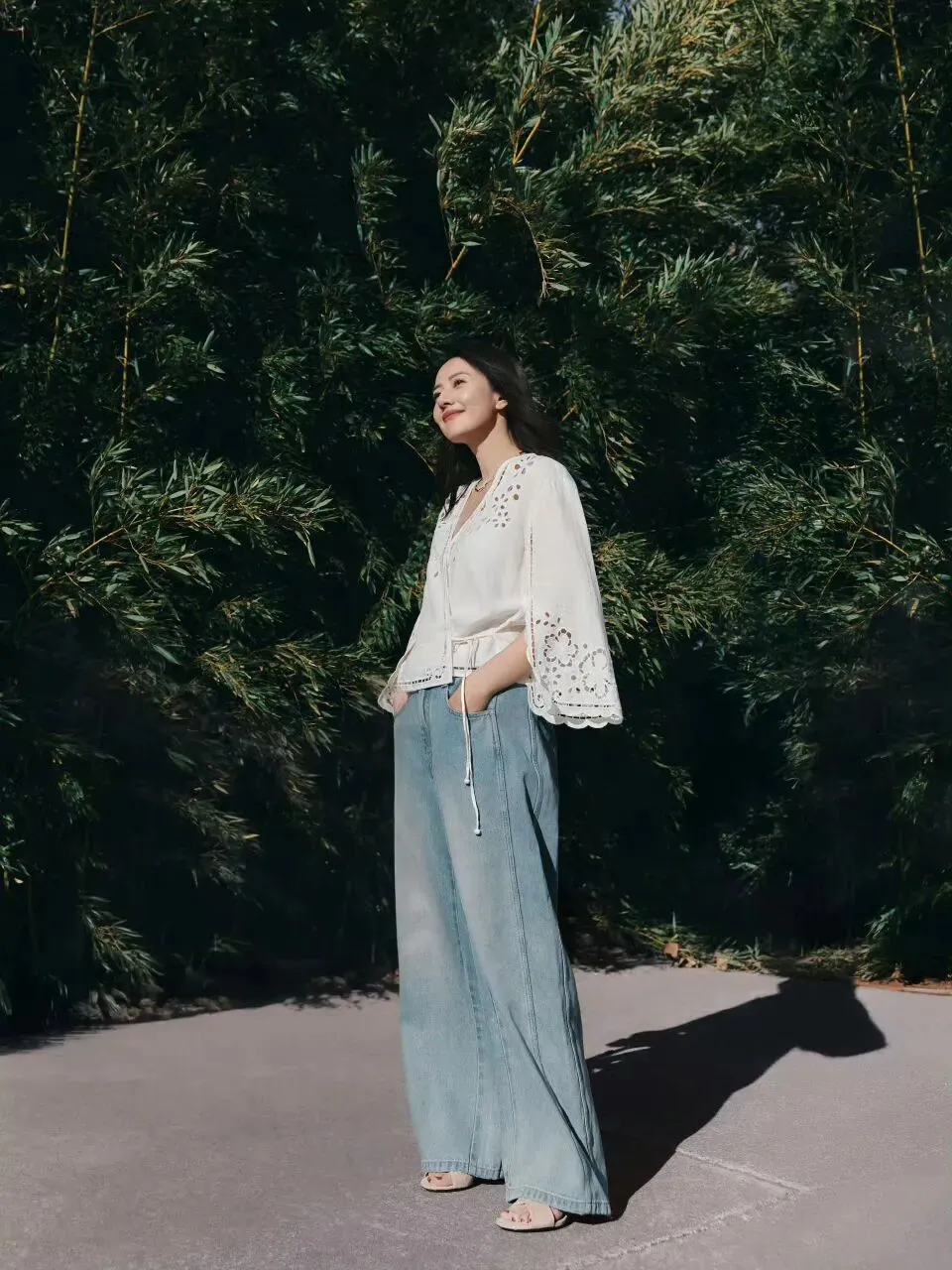 她的搭配相对简单,里面没有搭背心,直接穿,这样其实更干净。