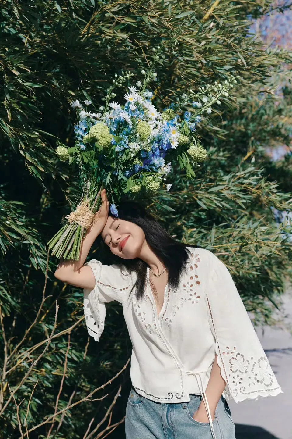 下身也是牛仔裤。完全是初夏的感觉。