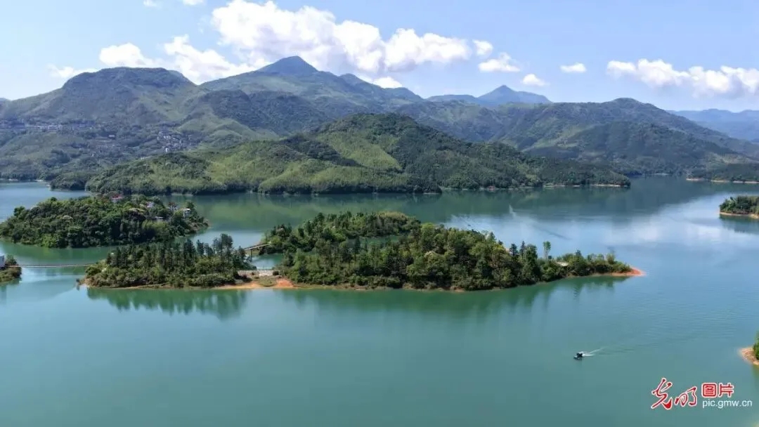 近年来,福建省福州市连江县小沧畲族乡立足生态资源优势,推动畲族文化与旅游产业深度融合,让群众在家门口共享乡村振兴成果。图为4月19日,小沧畲族乡春意盎然,游客乘船穿行碧波,尽览春日畲乡山水画卷。
