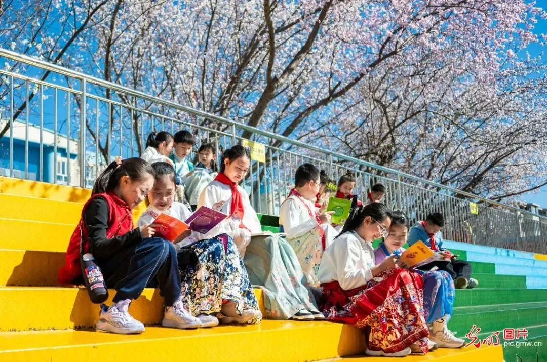 4月1日,内蒙古呼和浩特市赛罕区大学路小学“春风十里‘桃’醉书香”校园桃花节,学生们在桃花树下阅读。