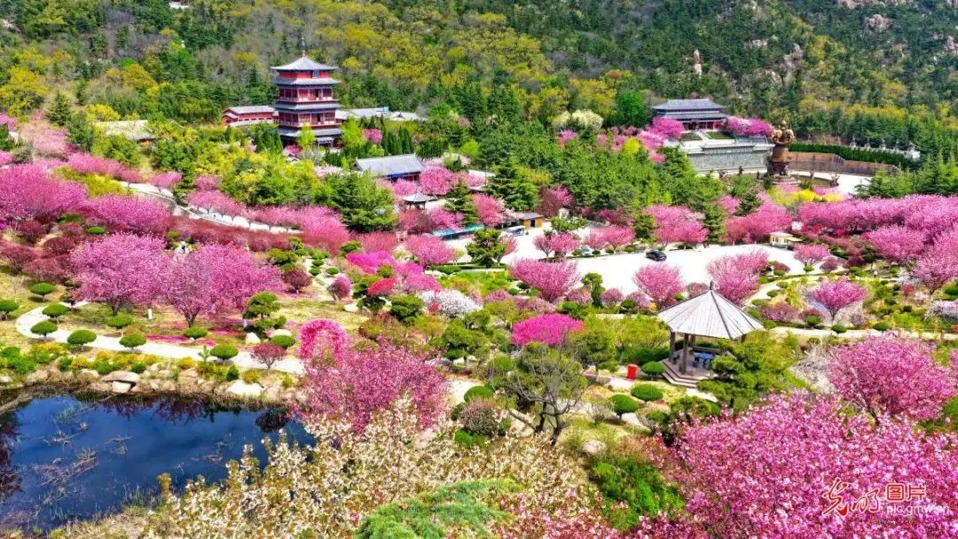 4月22日,山东省荣成市石岛湾畔赤山山谷内,春花绚烂,春光满目,引来众多游客竞相拍照打卡。