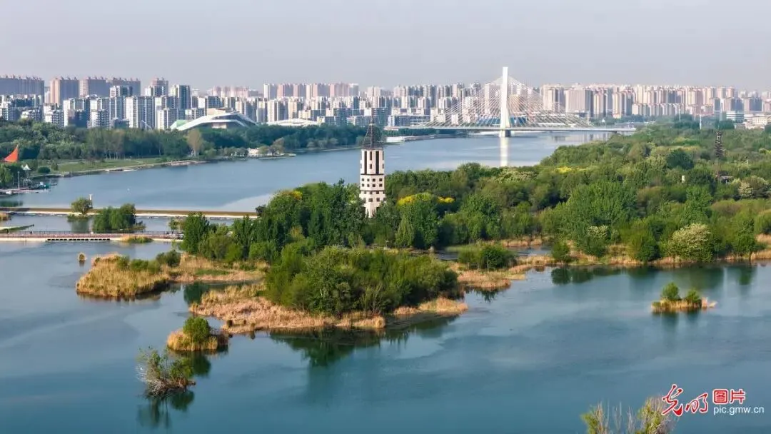 春日里,位于河北省石家庄市境内的滹沱河碧波荡漾,春意盎然。近年来,当地多措并举,对境内滹沱河流域实施了生态修复工程,目前已形成了集防护、观赏、休闲、健身和科普五大功能于一体的绿色生态景观长廊。图为4月22日拍摄的滹沱河(城区段)景色。