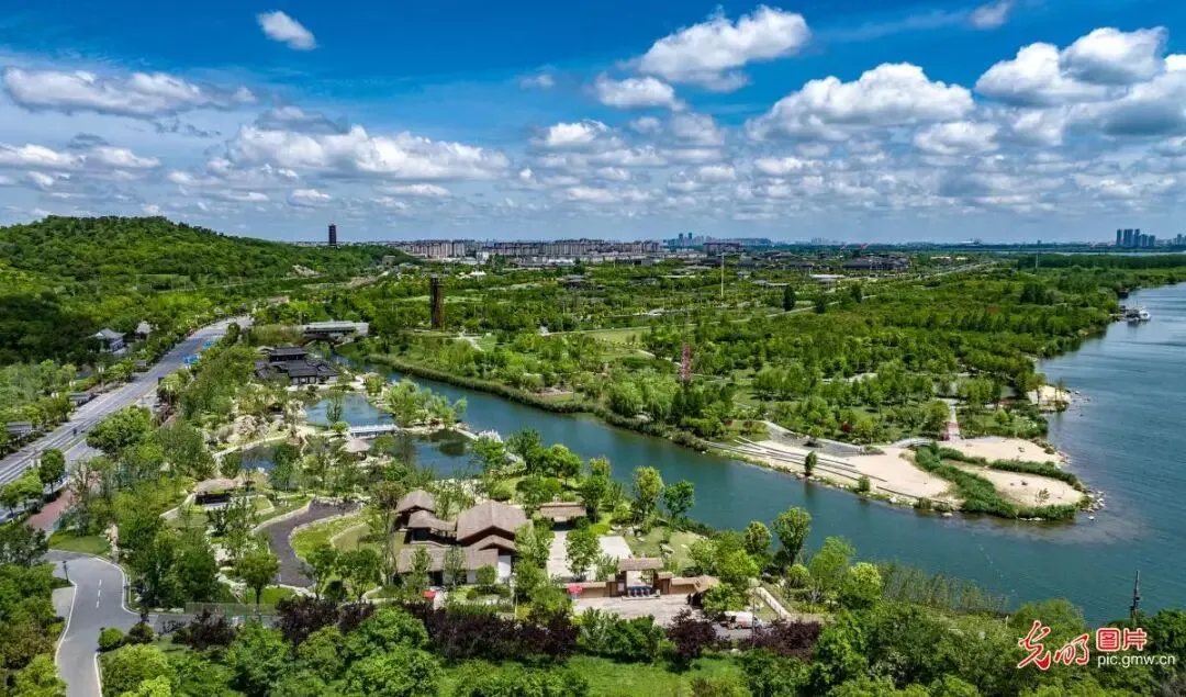 4月22日,湖北省襄阳市襄水岸线林木葱郁,蓝天白云映衬碧水,绘就一幅水清、岸绿、景美的生态画卷。