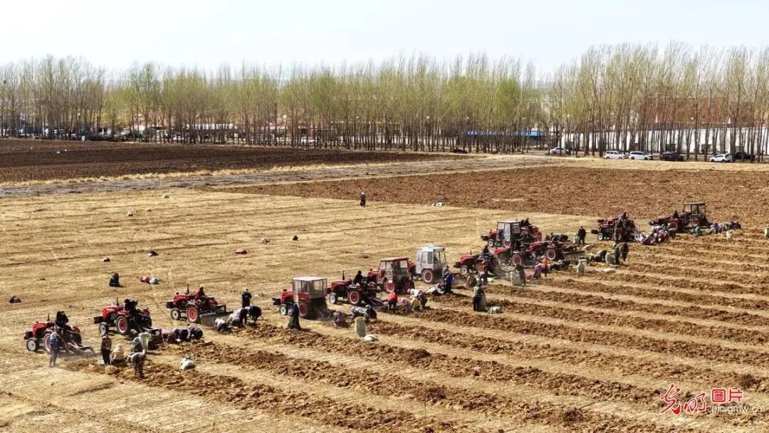 眼下正值棉芪采收的时节,内蒙古赤峰市松山区太平地镇牤牛营子村,360余亩棉芪种植基地里一派热火朝天的丰收盛景。图为4月22日,村民正在收获棉芪。