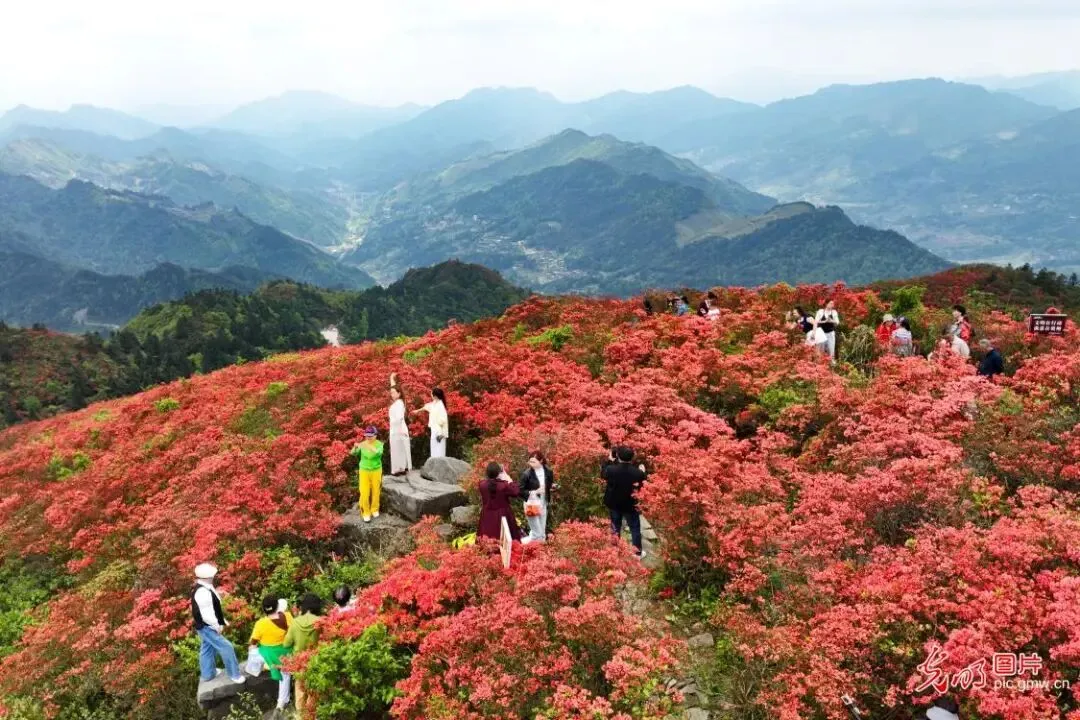 暮春时节,贵州省黔东南苗族侗族自治州丹寨县龙泉山的上万亩野生杜鹃花迎来花期,竞相绽放的花朵映红山岭,景色蔚为壮观,吸引众多游客前来观光赏花。近年来,丹寨县依托良好的生态环境和高山野生杜鹃花景观,“以花为媒”发展“生态花经济”,助力乡村振兴。