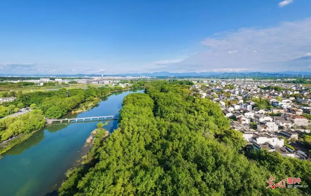 4月24日,安徽省黄山市徽州区西溪南湿地春光明媚,枫杨林新芽吐绿,与延绵流淌的丰乐河相映成趣。