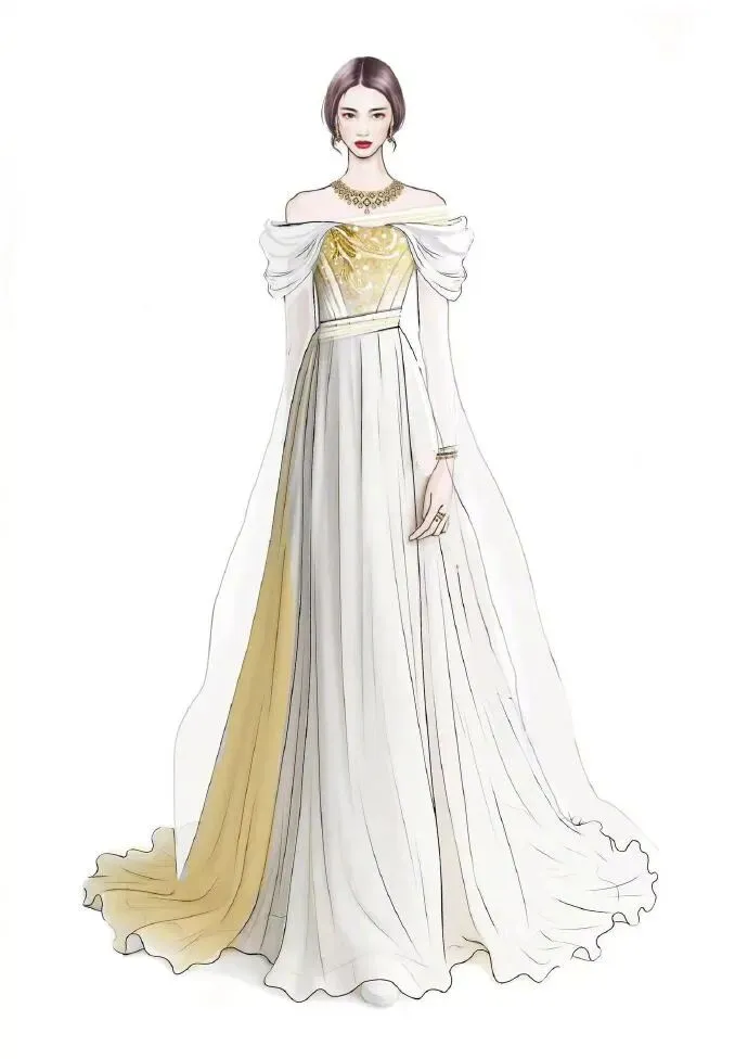 神鸟,是东方神话里的祥瑞意象,藏着自由与光明的美好寓意;星汉,是中国古典诗词里最浪漫的宇宙符号,是 “星汉灿烂,若出其里” 的磅礴胸怀。设计师将这三大核心意象完美融合,以米白色的柔润面料为画布,以鎏金立体刺绣为笔墨,织就了这件既有庄严神性、又有东方柔美的华服。