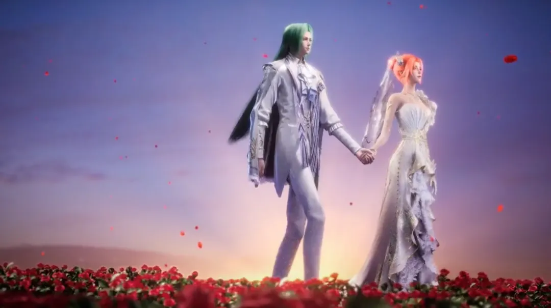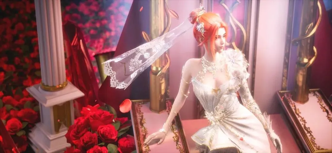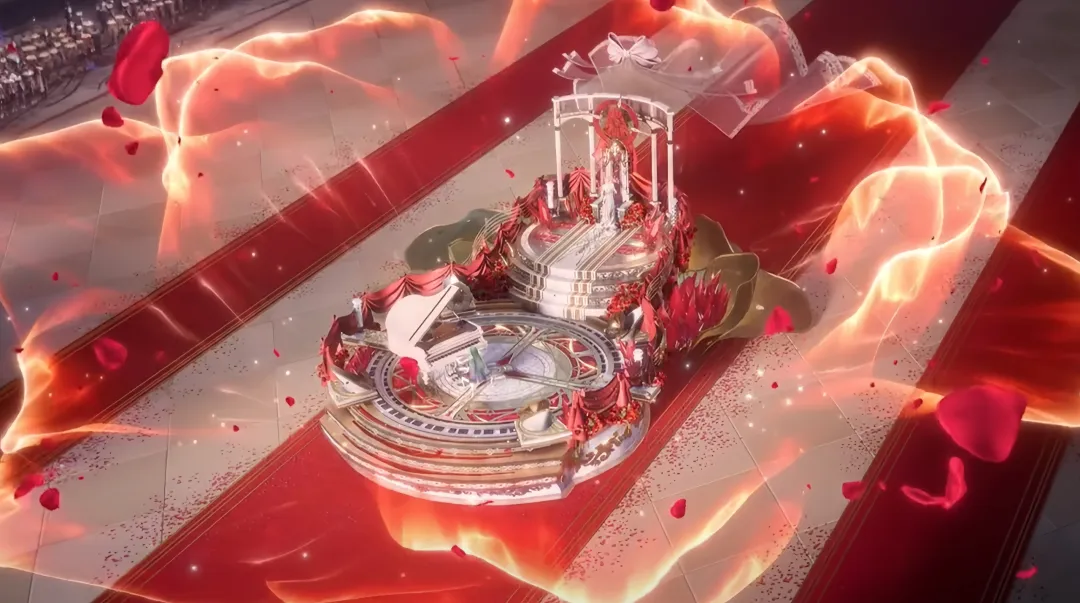 鑫馨的红色玫瑰婚车,是感情最热烈直白的体现。红色火焰对应了林鑫火系魔法师的身份,也象征着他对李鑫炙热不变的爱意。双层圆台搭配上层花亭,就像是他们爱情的闭环,终于迎来圆满结局。