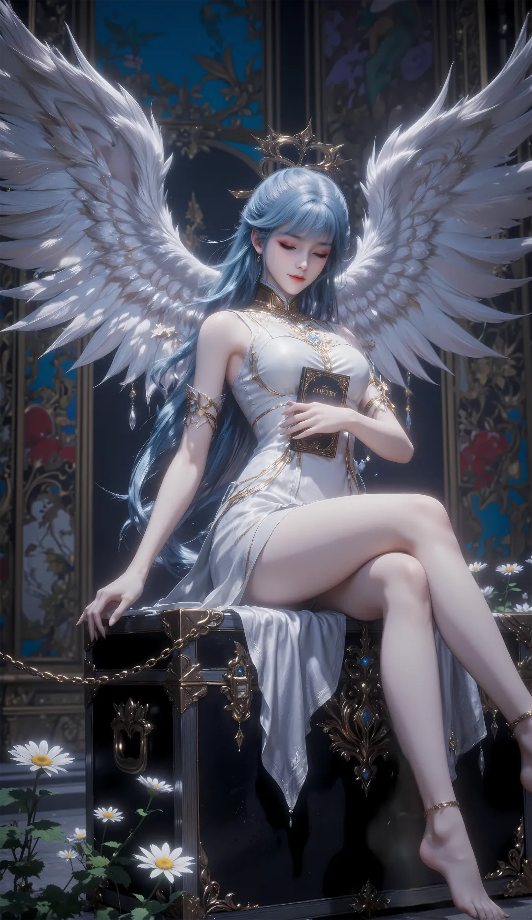 她有一头冰蓝色长发,发丝如瀑布般垂落,发尾在身后微微飘动。她的五官精致立体,双眼微闭或低垂,神情安详而宁静,仿佛在沉思或祈祷。