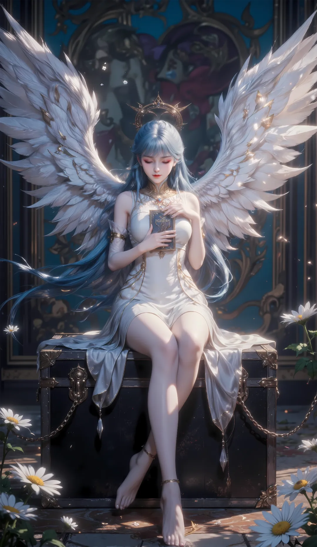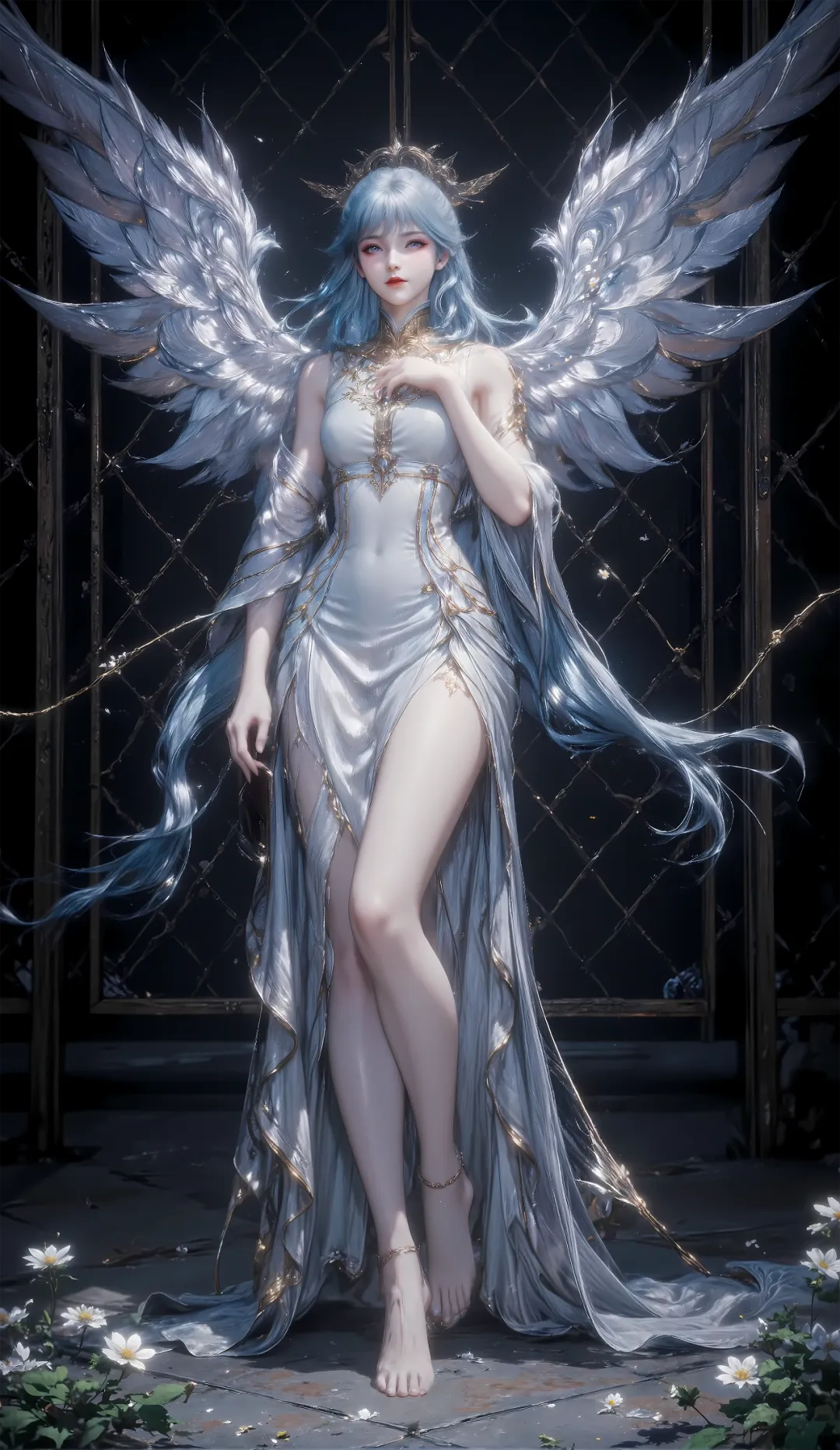 裙身点缀着金色的镶边与装饰,从肩部延伸至腰部,增添了一丝华贵与神圣感。她的脖颈、手腕和脚踝都佩戴着金色的饰品,头上戴着一个金色的荆棘状光环,象征着神圣与牺牲。
