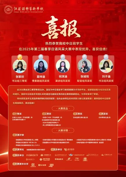 在连续两届春芽外语风采大赛中,我校24级及25级学子表现突出,在演讲、书法、配音、情景剧等多个类别均斩获多个奖项,充分展现日语教学与综合素质培养的扎实成果。