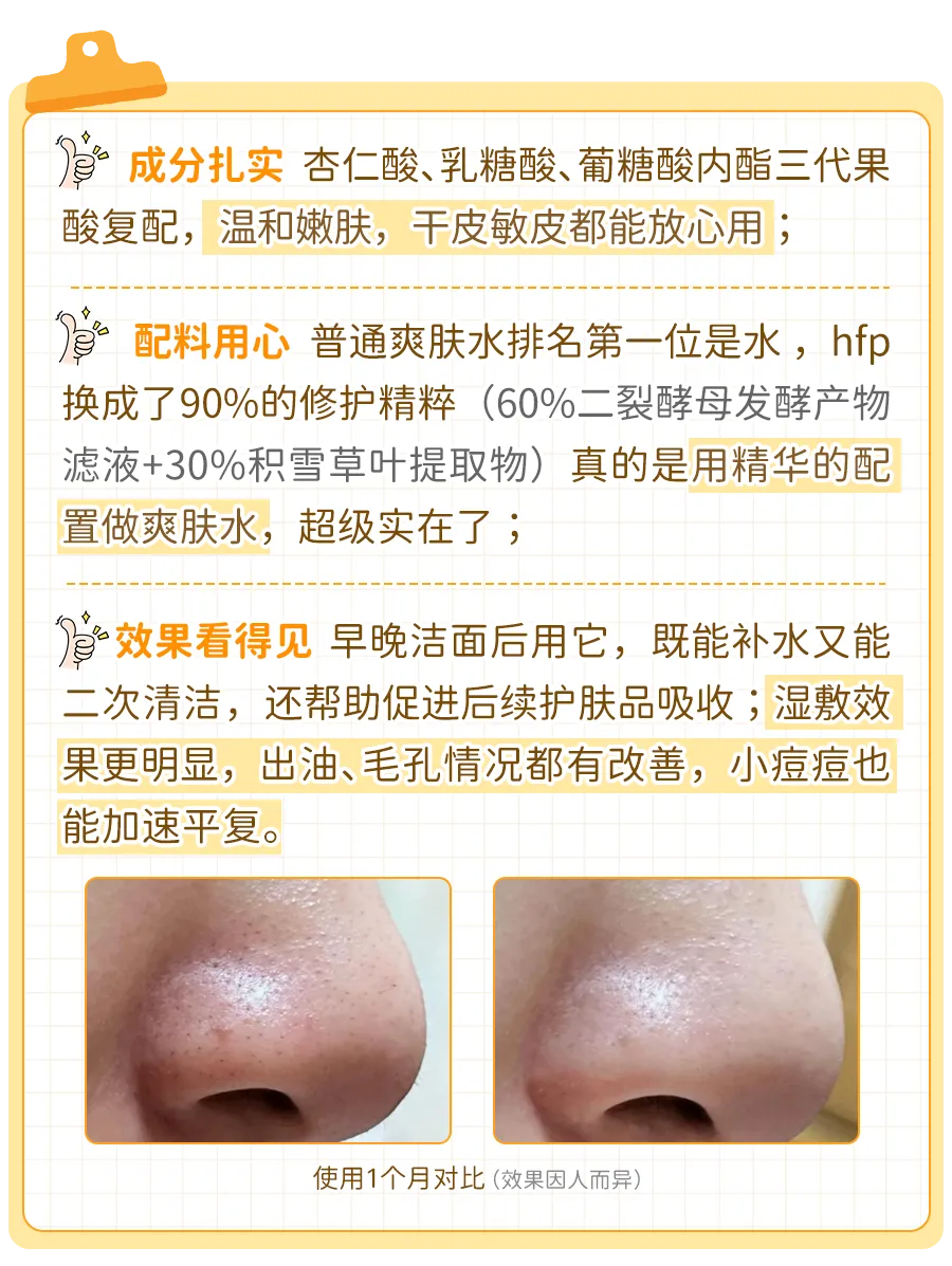 之所以效果明显,主要是因为这款 hfp 果酸精粹水的成分用的平衡又扎实。