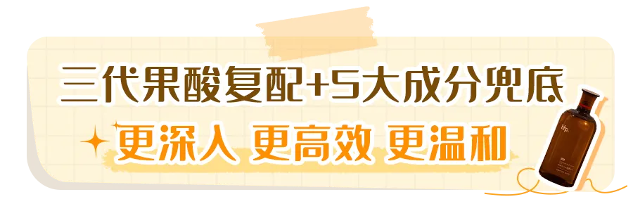 它采用的是乳糖酸+葡糖酸内酯+杏仁酸 3 代果酸复配,大中小分子协同,既能够分段作用于肌肤各层,溶解油脂、黑头,疏通毛孔。又能解决单一酸的刺激,更加温和高效