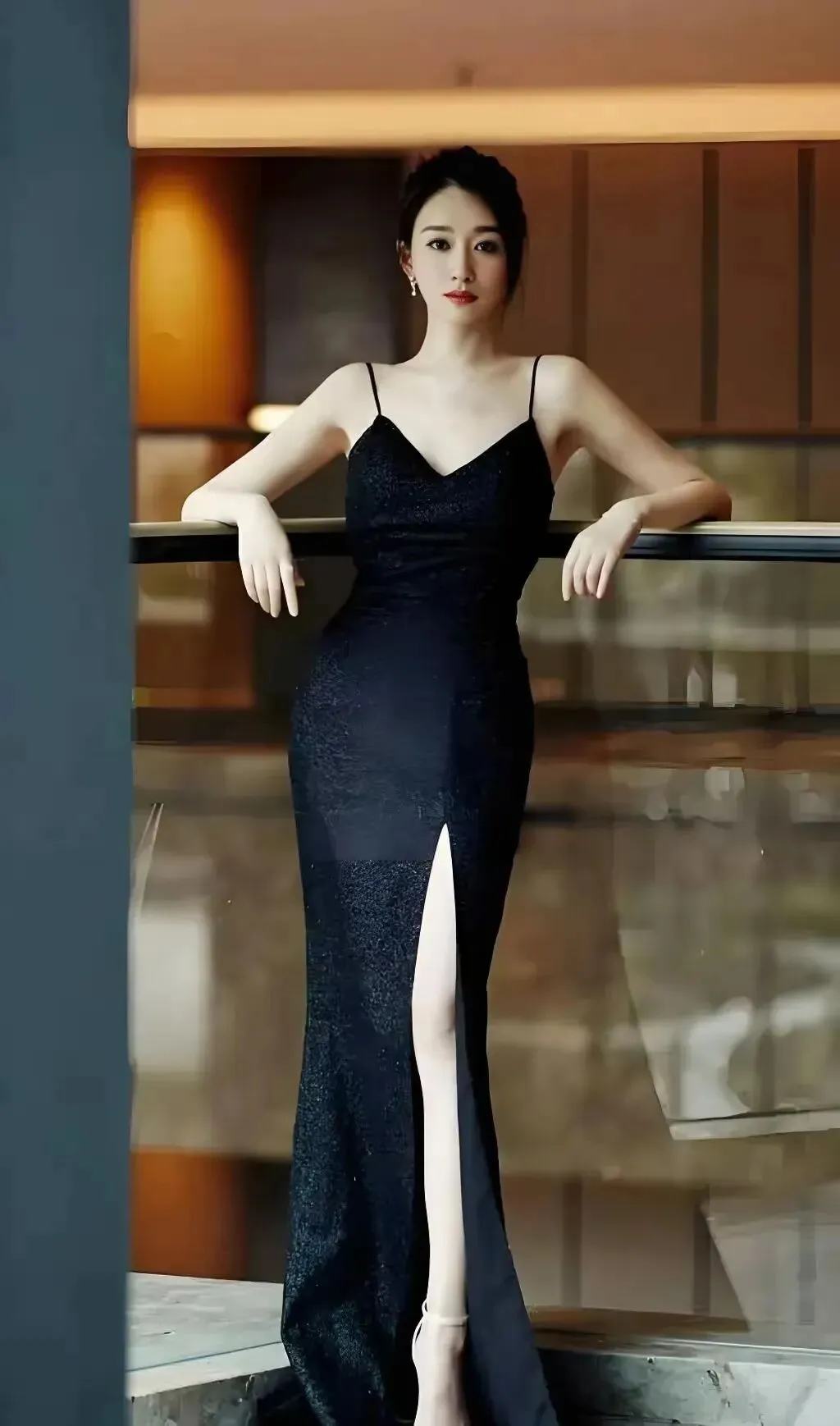 提到李小冉的身材,就不得不提她那件封神的“蓝黑渐变高开叉礼服”。在那组照片中,她身着一袭吊带式渐变长裙,蓝得如孔雀石釉,黑得像深夜丝绒,两色在腰线处自然融合。