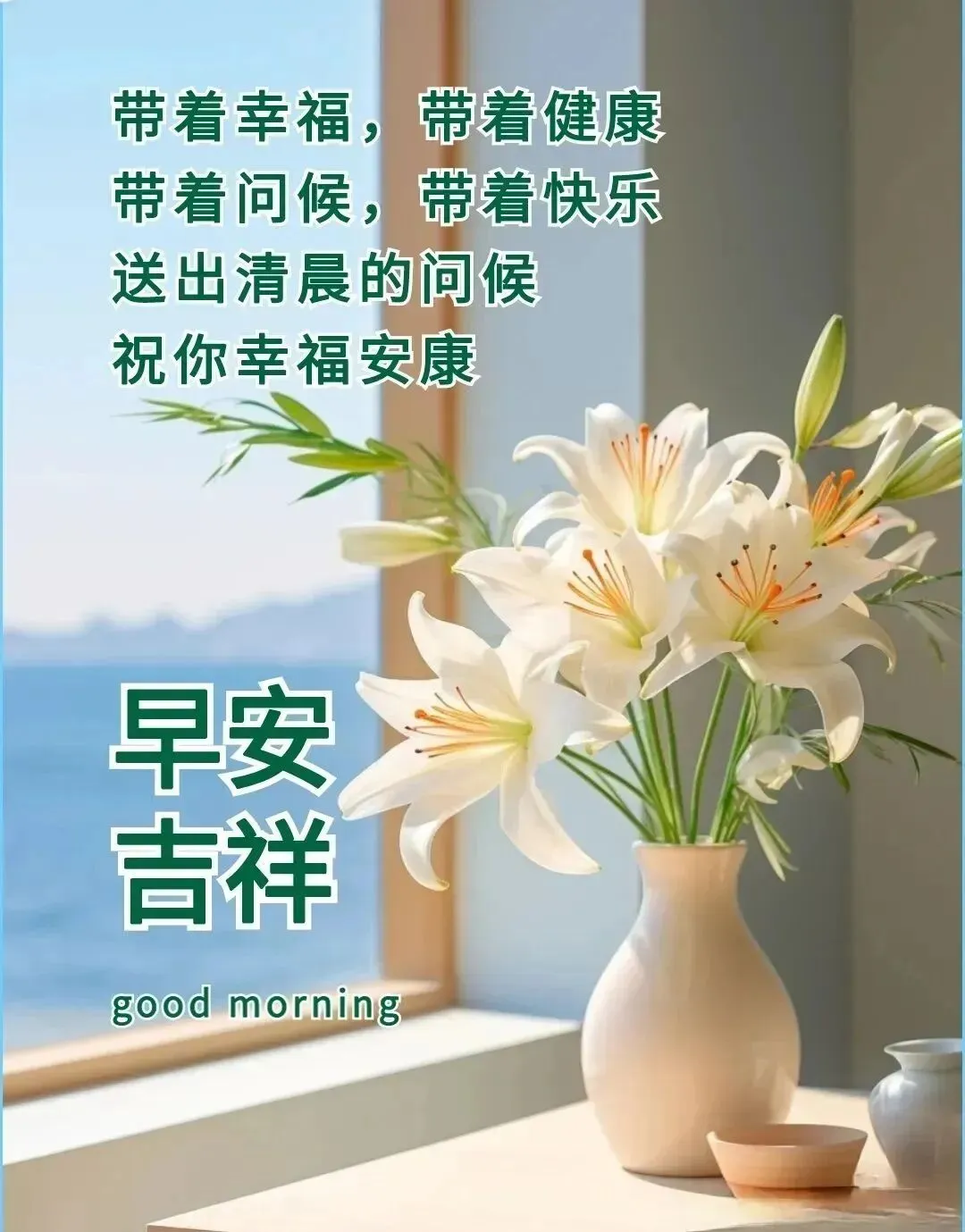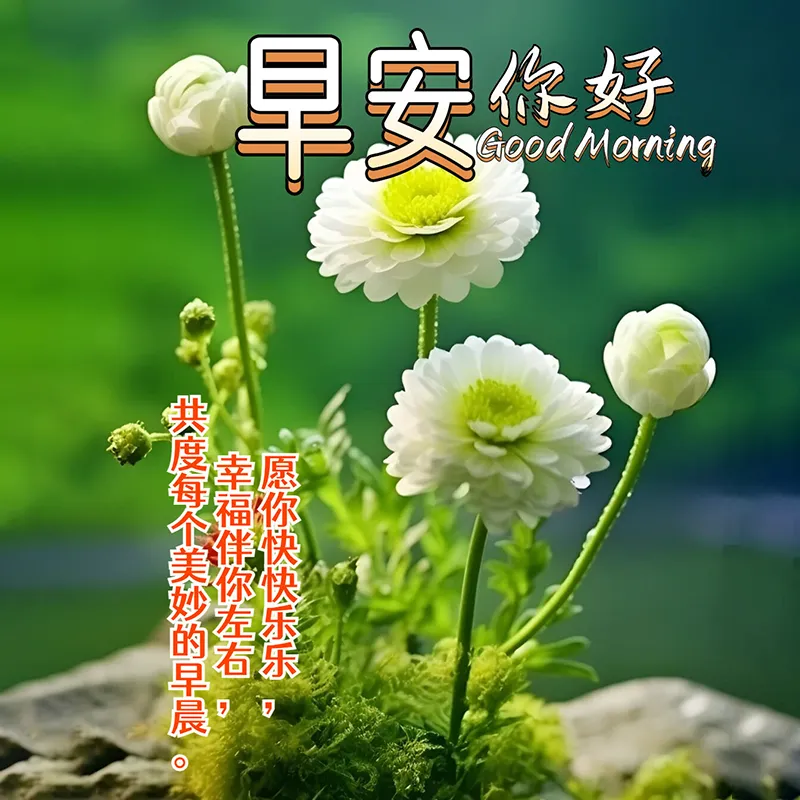 8,清晨的招呼不一般,载着幸福和平安。吉祥如意送给你,健康快乐每一天。早安吉祥!早安!