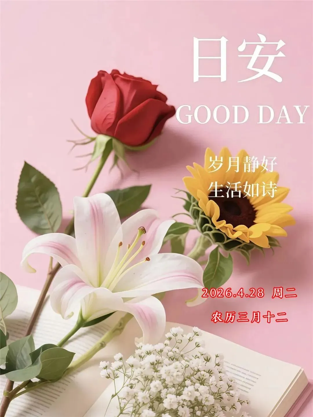 🌈今天是4月28日,🌅好事放心头,烦事顺水流,🌊淡然一笑别昨天,💐美好心情迎今天,💕健康身体迎明天,🌸笑对人生每一天!💖周二早安!🌞