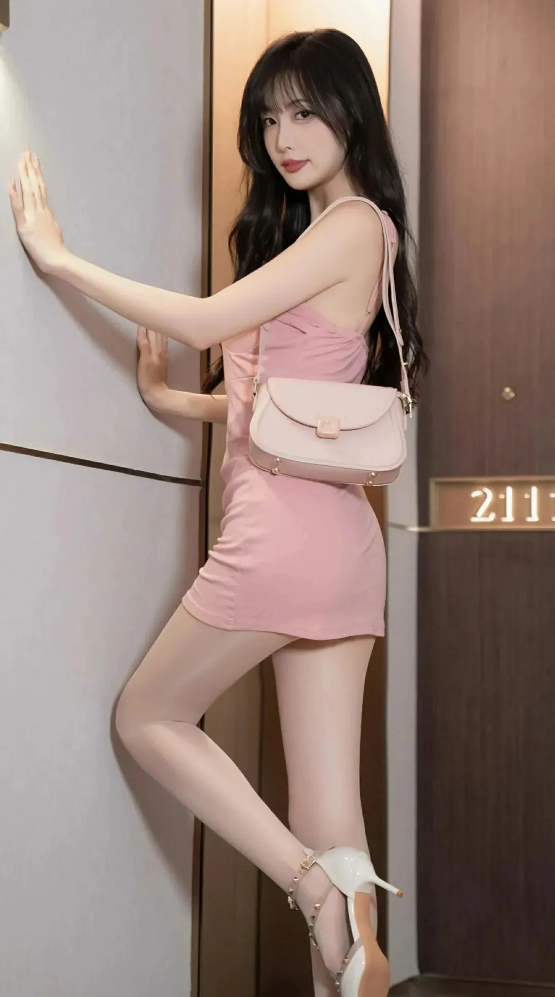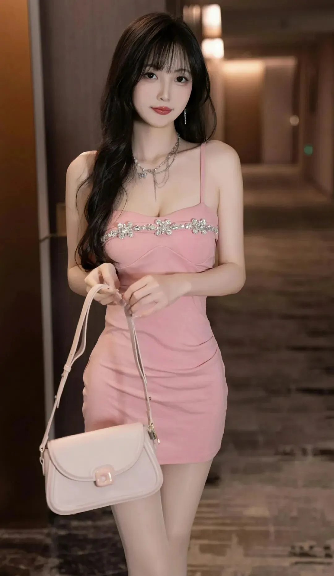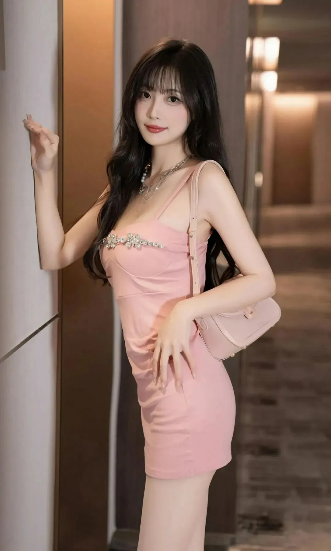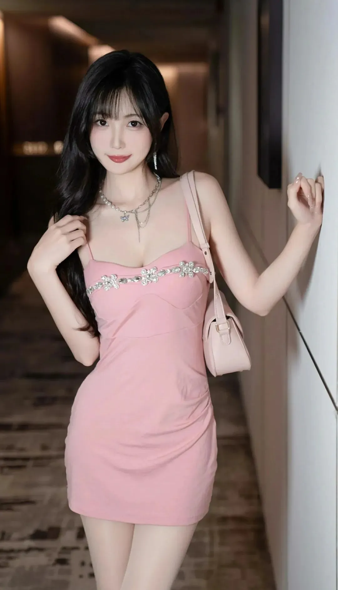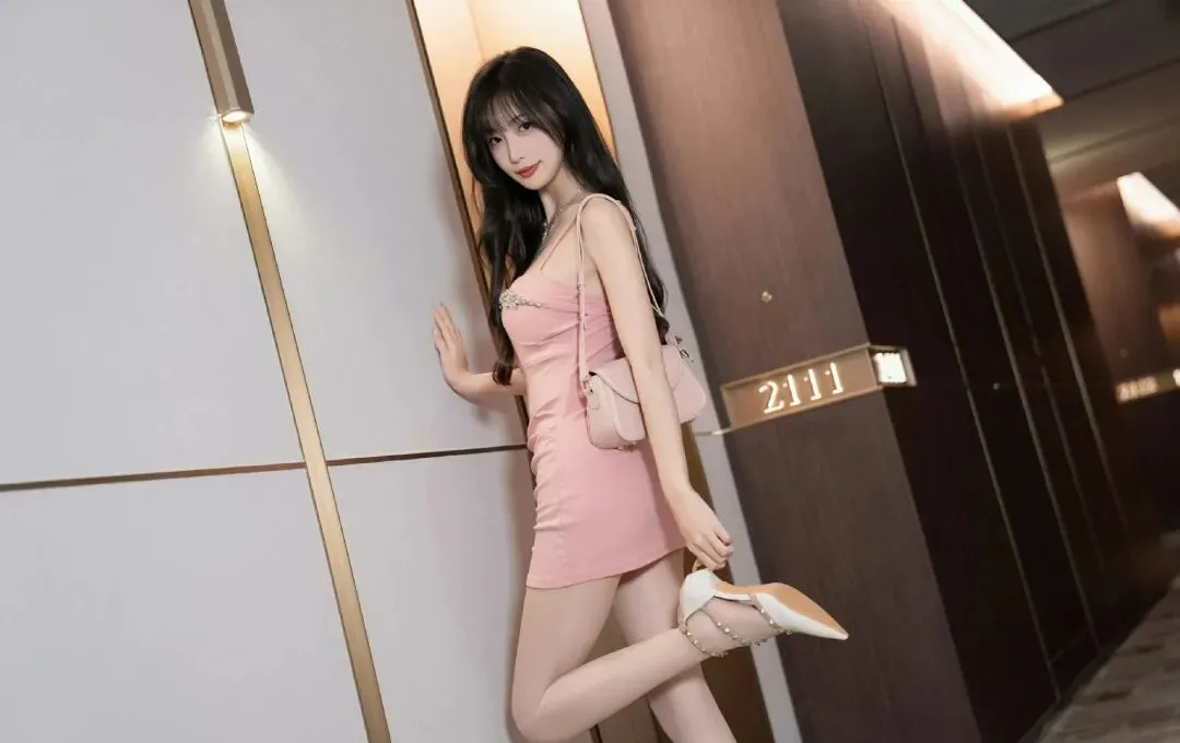 水晶装饰是她的隐形滤镜。胸前的水晶在光线下折射出细碎的光,与颈间的银色项链形成呼应,让胸部的线条在视觉上被拉长。耳尖的碎钻在阳光下折射出细碎的光,与粉色吊带裙的柔和形成冷暖交织的对比,让她成为空间里的视觉焦点。白色高跟鞋的鞋跟高度为8厘米,既让小腿肌肉呈现优美的线条,又让斜倚时的重心更稳定。鞋面的金属铆钉与粉色手提包的金属扣件形成色彩的呼应,让整体造型更具统一感。她斜倚时,脚尖微微内扣,这个姿势让腿部的内侧线条更显柔和,臀部的肌肉微微收紧,让腰臀比更惊艳。