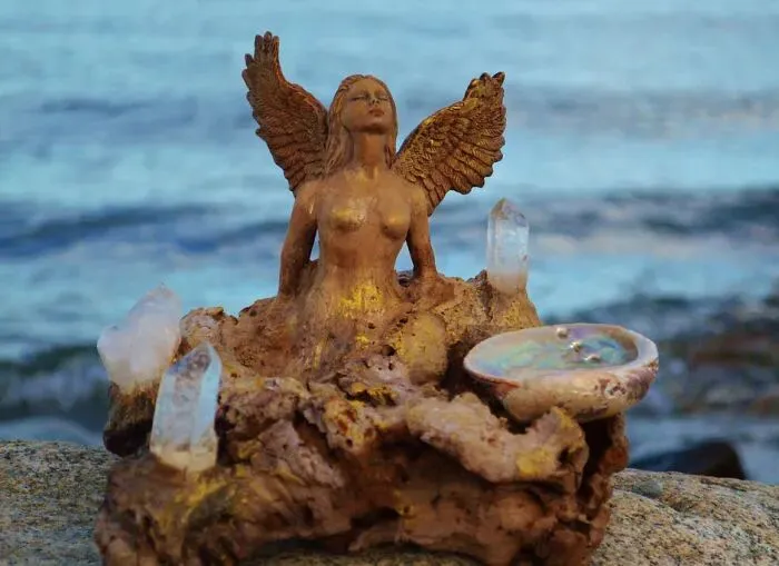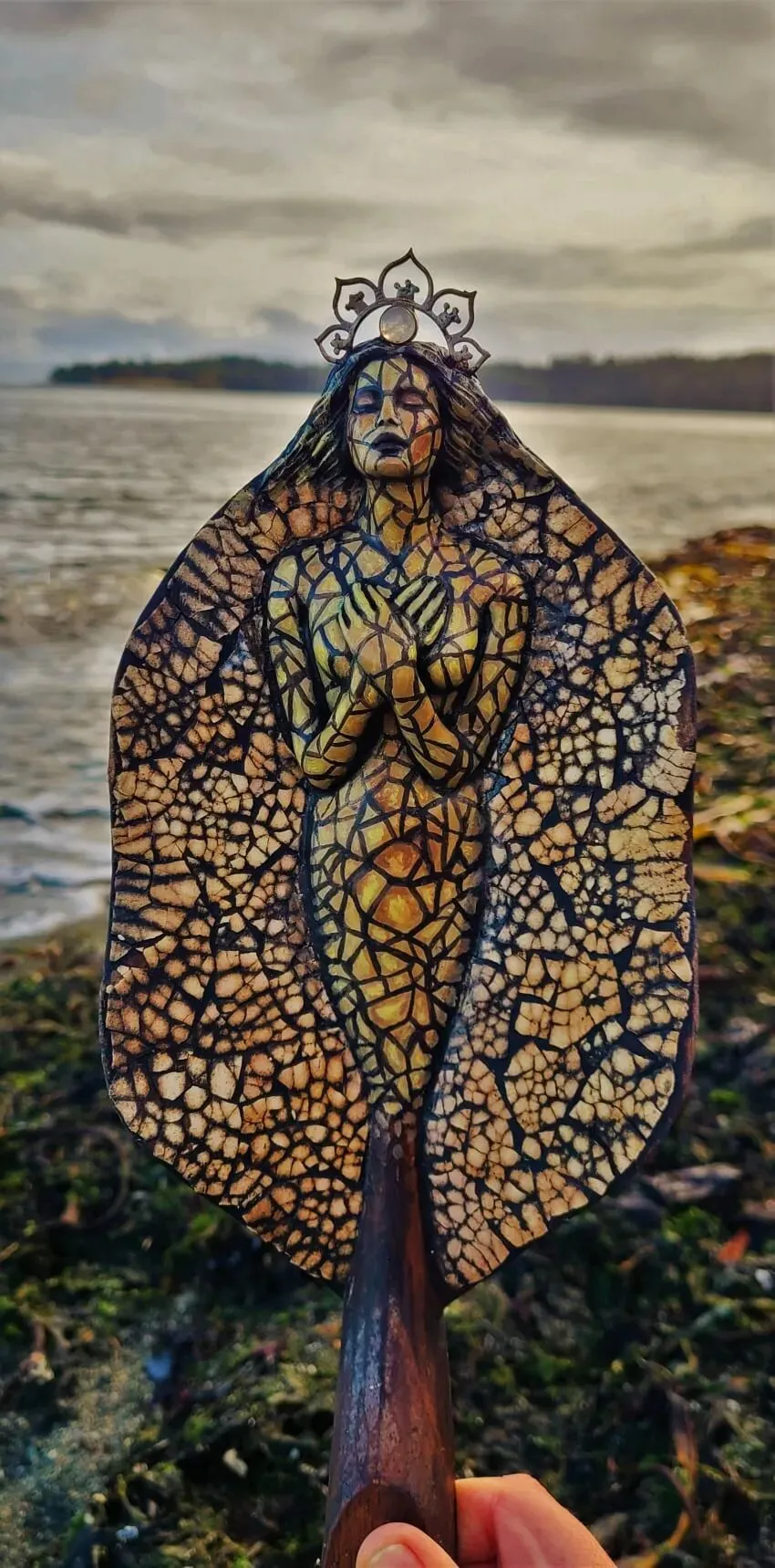 尤其是贝壳的运用,让木雕女神在坚毅之外,多了一份恰到好处的柔软。