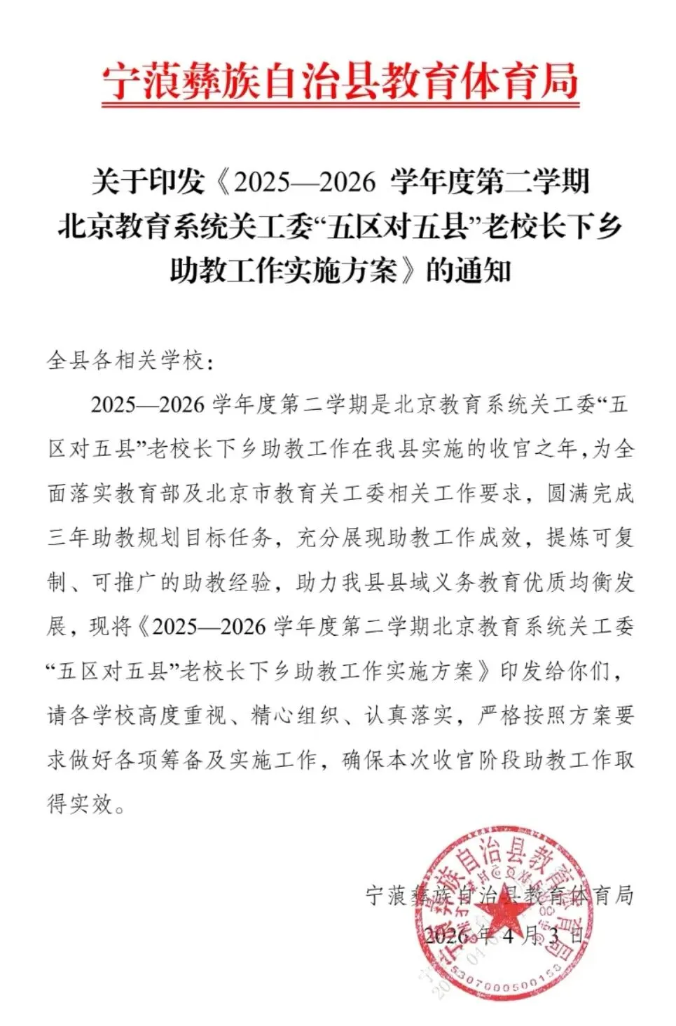 4月13日至17日,北京教育系统关工委“五区对五县”老校长下乡助教活动迎来收官之行。五位老校长再次深入宁蒗,为历时三年的帮扶项目画上圆满句号。