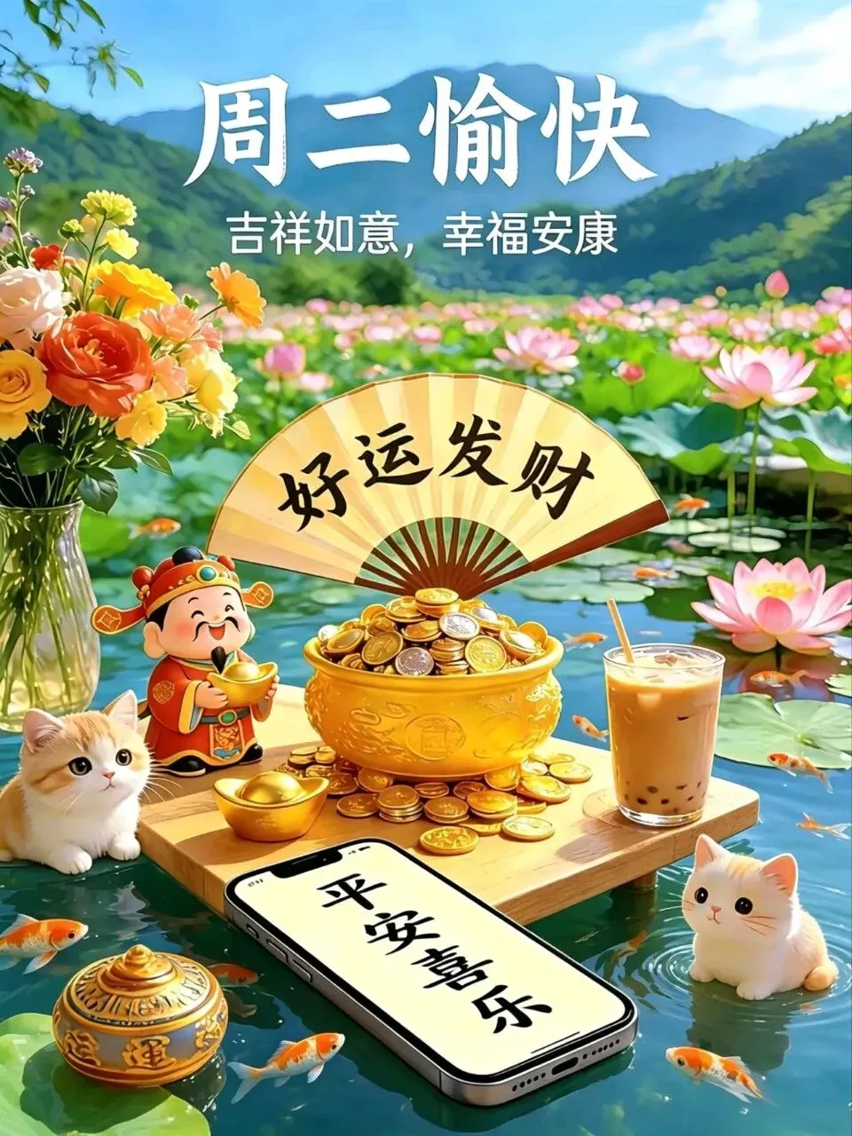 💓早安晨曦送福至,财源滚滚笑开颜。🌊身体健康永无忧,福禄双全喜迎来。🍁心想事成事事顺,每天笑容更加甜。🌞朋友早起心情好,幸福安康乐逍遥。🌷
