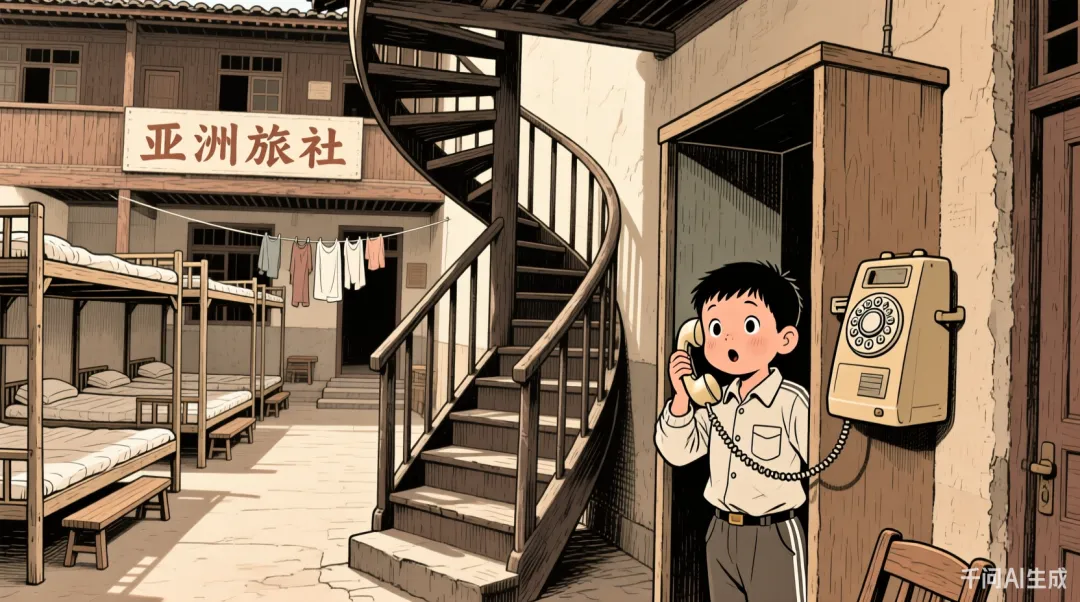 楼梯的拐角处有个电话间,这是我的乐园。因为里面有一台拨号盘式的电话机,一拨上面的转盘就会边“咔咔”作响边往回转,里头还有人讲话,神奇极了。每次跟着父亲去找赵叔,我都会趁人不注意,悄悄溜进去拨着玩,乐此不疲。但每次都会被服务员阿姨逮个正着,“哪家的小娃,好好管一哈”,父亲只得尴尬地出来认领我。