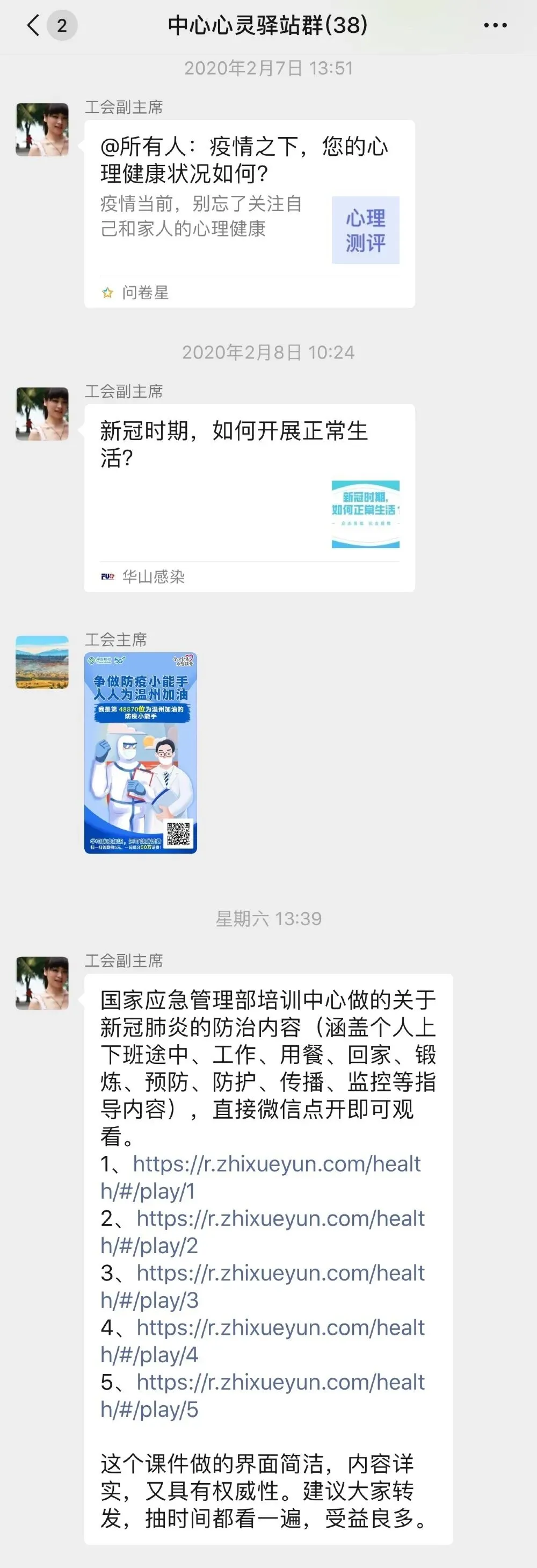 中心工会充分利用心灵驿站平台,积极开展宣传引导和心理疏导。通过电话、微信了解女职工生活和身体情况,互联网线上接收、答复职工诉求,转发资讯、推荐分享阅读等方式广泛宣传防控措施及防范意识,积极传递正能量;不聚会、不信谣、不传谣、不恐慌,引导职工管理好情绪,释放压力;从个人防护、心理调节、宣传配合、人生思索等方面,女职工之间互相分享心得,稳定人心,营造积极向上的战“疫”氛围。