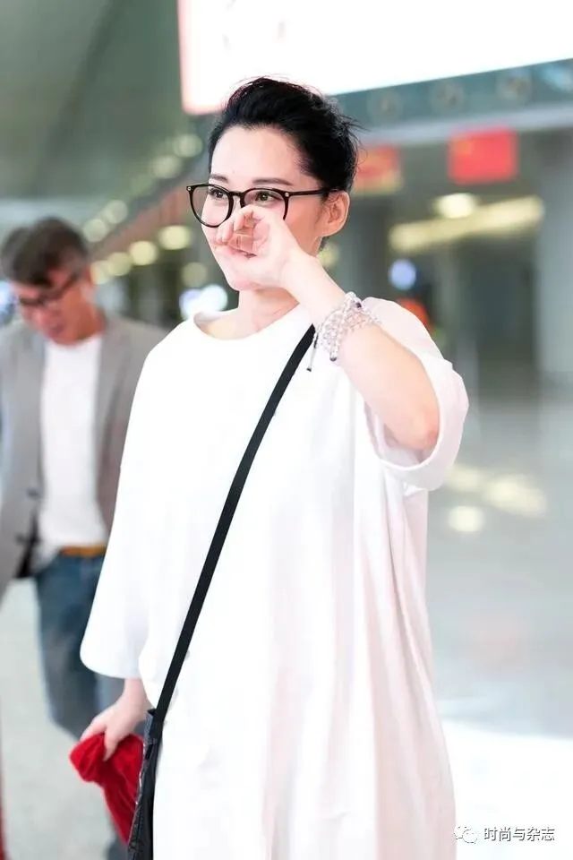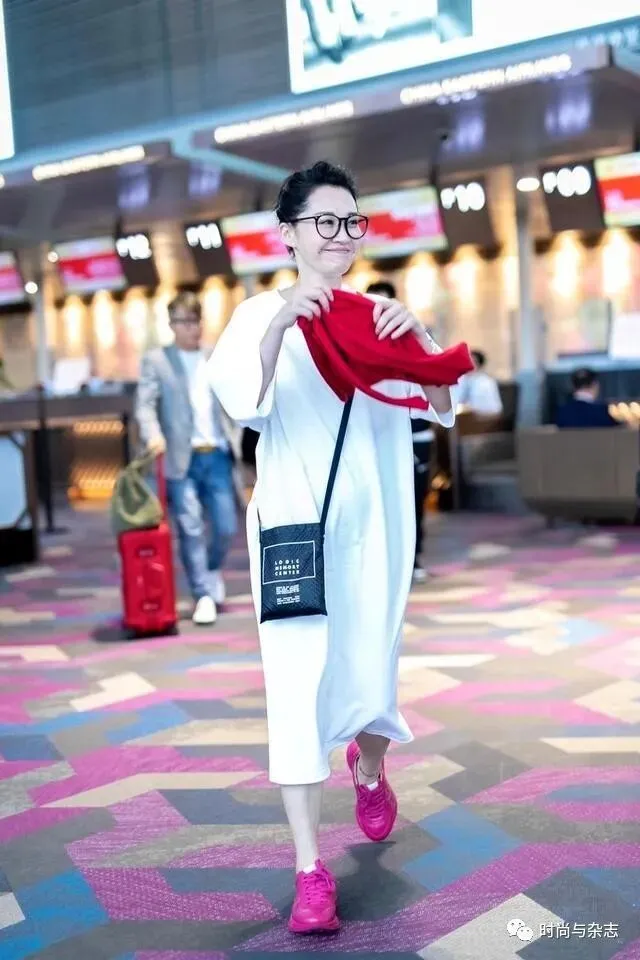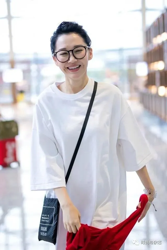 白色是非常减龄又清新的颜色,还可以还原一个人最本真的美感,对于许晴这样由内而外的少女心与少女气质来说,白色可以衬得她更加的透明单纯,给人一种清新少女的形象。所以简约干净的浅色系是有着很棒的减龄效果的,搭配上部分亮色系的配饰,就可以既优雅简约又明艳活泼,更具魅力。许晴真是冻龄女神,穿长款白色T恤走机场减龄时髦,气场全开。