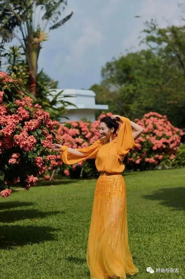 明黄色的连衣纱裙的上衣部分是非常复古优雅的设计,法式宫廷风的感觉衬得许晴精致又动人,宛若上世纪的名媛小姐一般,梦幻又浪漫的纱裙也是飘逸又灵动,增添了一丝仙气飘飘的感觉,女神范儿十足。