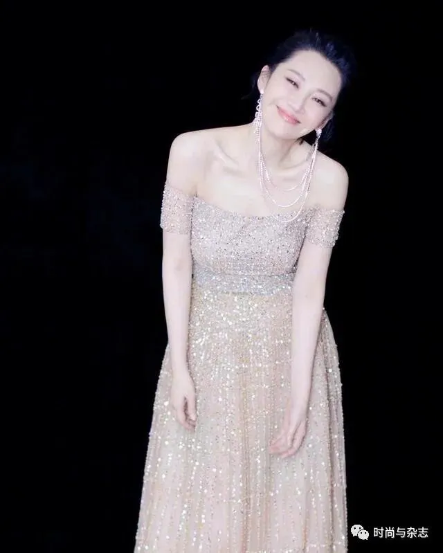 一字肩的裸色连衣裙有亮片的设计,看上去流光溢彩,衬得许晴也光彩照人,一字肩还露出了漂亮的肩部线条与精致的锁骨,更显气质与身材。别致的耳饰也是抢眼又吸睛,还增添了整套穿搭的层次感与设计感。