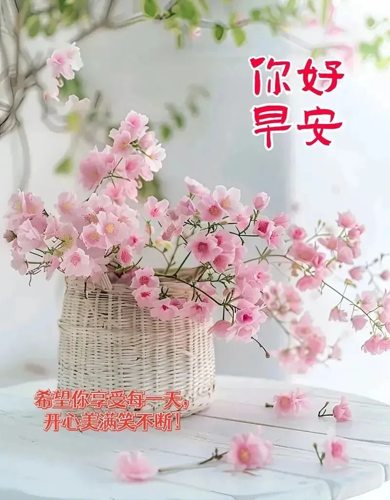 18,早晨好,亲爱的朋友!花开的美丽给你带来好运气,微风的轻吻伴你起舞。愿你的一天充满欢乐和惊喜,阳光照耀你的微笑。早安,愿你的每个早晨都充满希望与幸福!早安!