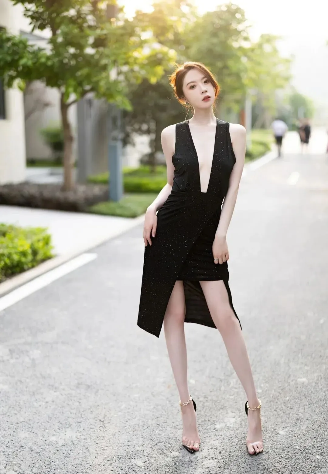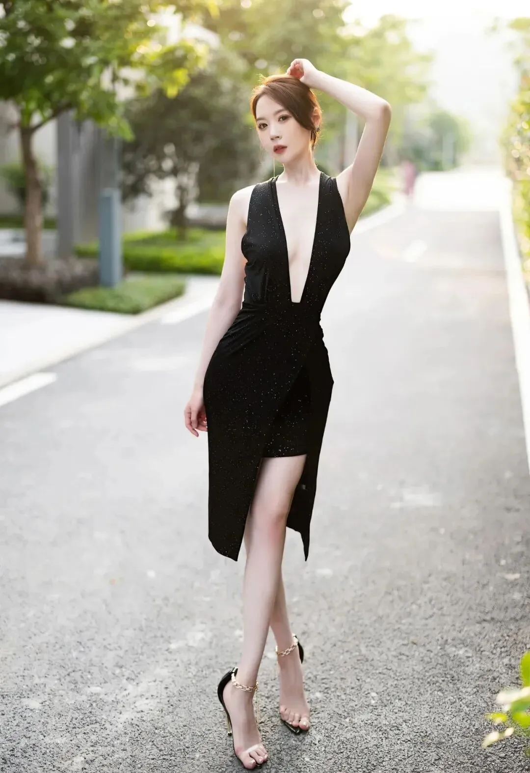 黑色深V长裙,领口直接开到了肚脐眼,酥胸半露,大胆展示傲人身材,下半身短裙的设计,将一双美腿展露无遗,尤其是搭配上高跟凉鞋,露出精致的小脚,既性感又迷人。 ▼