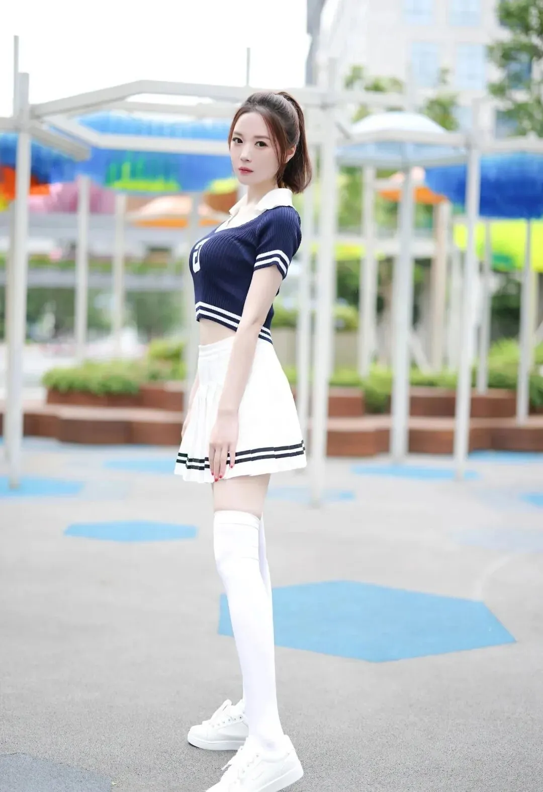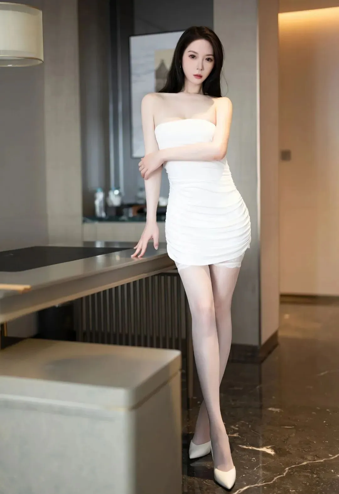 白色抹胸穿搭连衣裙,搭配白色过膝长筒袜和白色高跟鞋,一身洁白,别有一番韵味。