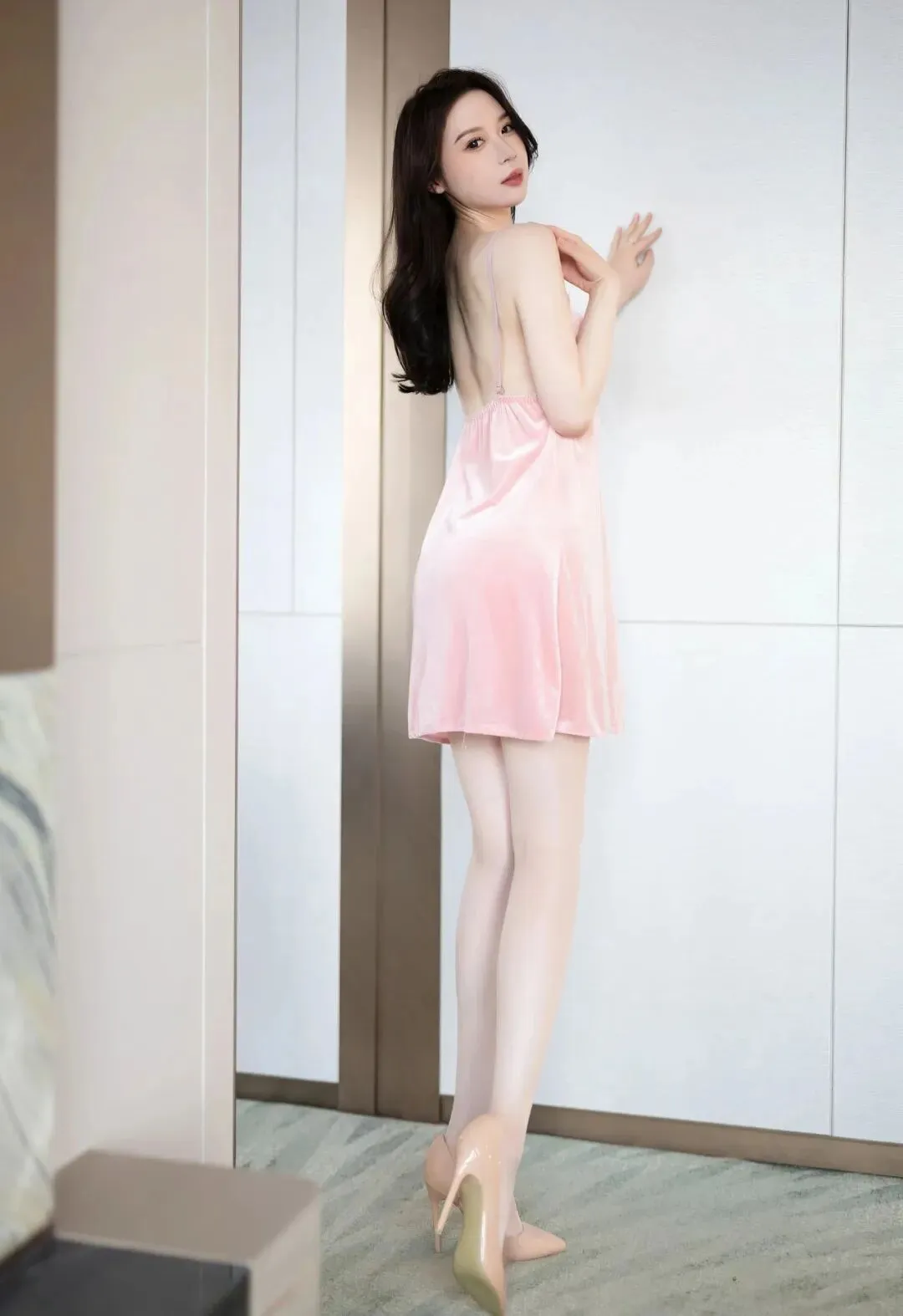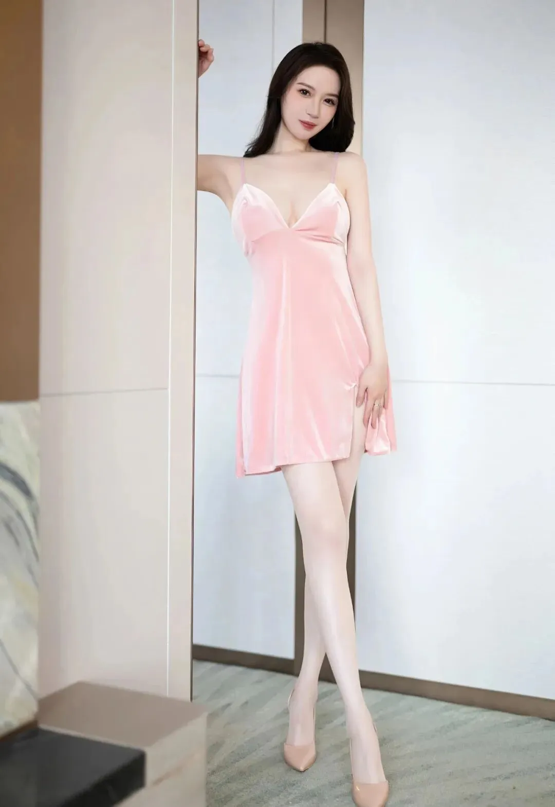 粉色挂脖超短连衣裙,搭配肉色丝袜和肉色高跟鞋,丝袜的红色虾线非常独吸睛。