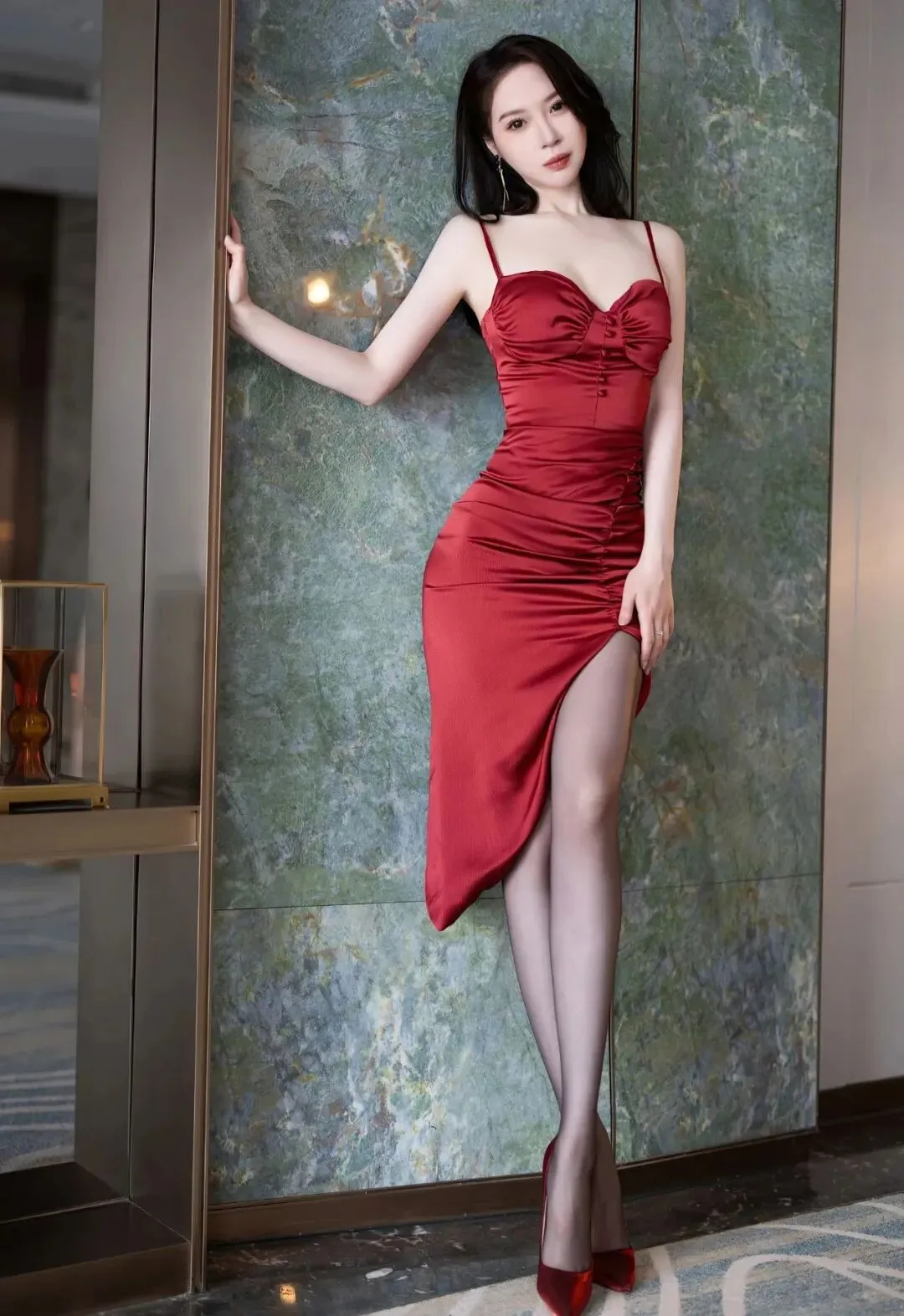 红色吊带长裙,不规则的裙摆,将一双黑色美腿展现得淋漓尽致,搭配红色高跟鞋,绝美。▼