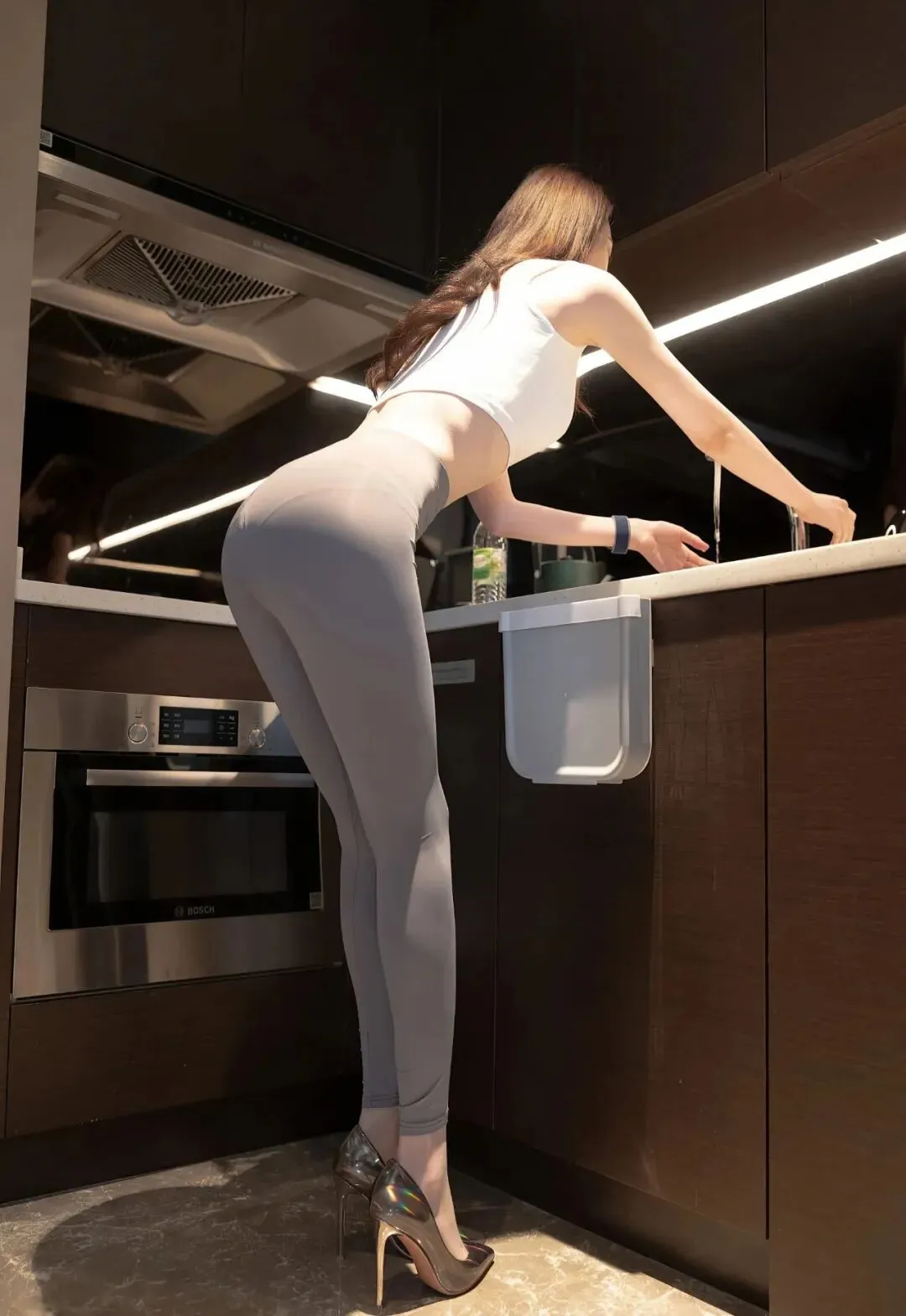 白色吊带露脐小背心,搭配灰色瑜伽裤,脚踩金色高跟鞋,这小翘臀看上去非常性感。▼
