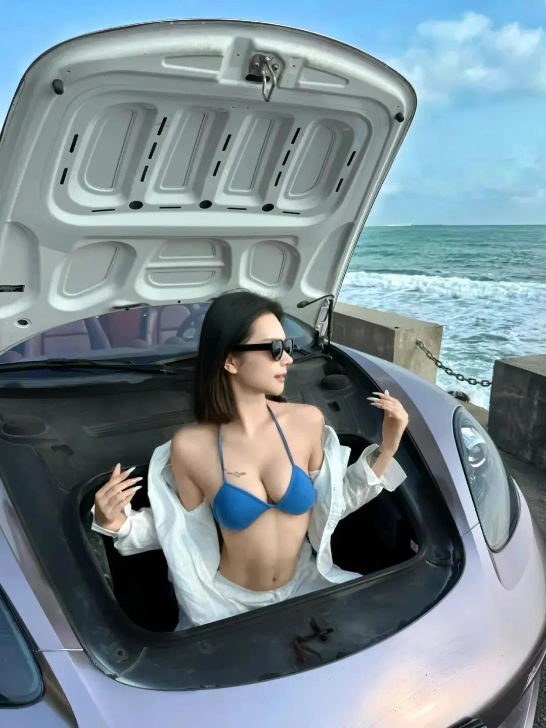 第一张抓住的是光线的对比。车头盖掀开后,海天的明亮从上方铺洒进来,模特坐在车里,白色衬衫成为纯净背景,让蓝色泳装成为视觉焦点。拍摄时我尽量让镜头在胸前略微下方,强调锁骨线条和身材曲线,同时保持手部自然摆动,避免僵硬。镜头角度略向下,拉出车门边缘的线条,增强画面的纵深感。后期保持肤色自然,海天颜色偏冷以突出主角。