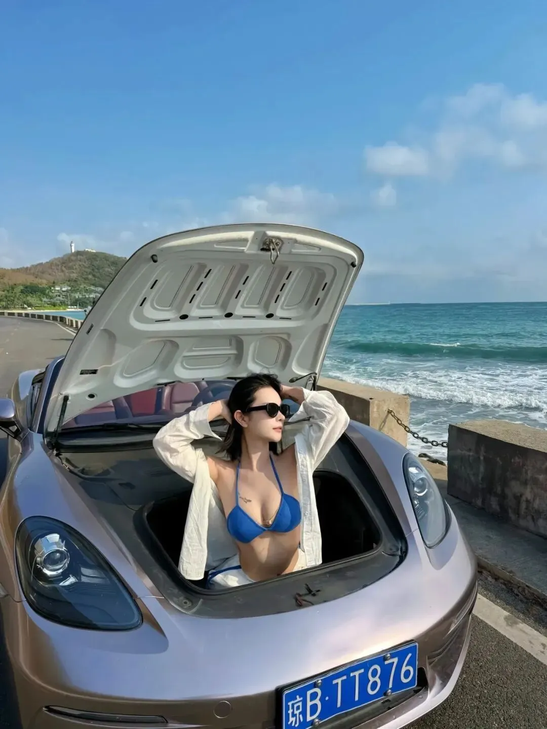 第四张以中景呈现,模特半抬手整理发型,披着白色外衣在海风中显得随性而有线条感。镜头距离保持适度,让车头与海岸线并列,产生前后景的层次。她的姿态比前几张更放松,肩颈线条更柔和,蓝色泳装的尖端在胸前形成清晰的视觉锚点。随风摆动的外衣带来动感,但整体不过度夸张,保持自然的日常感。光线方面,午后偏高的太阳让肤色柔和但不失硬度,后期适度提升对比,让颜色更干净。