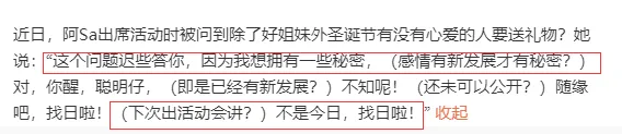 实际上,阿Sa也并没有想藏这段感情,甚至自己都预告过“我想拥有一些秘密”,说“找日(再讲)啦!”