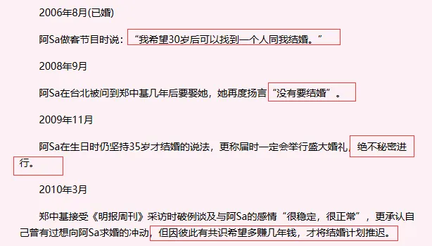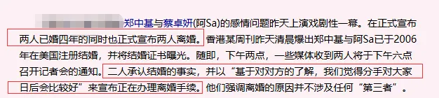 2010年,港媒突然爆料郑中基和阿Sa早在2006年就在美国注册结婚,且公开了结婚证。让人没想到的是,隔天两位当事人开记者会不仅承认已婚四年,还同时宣布离婚......