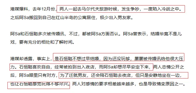 他们屡屡被曝出要结婚的消息,但石恒聪就是不求婚。港媒不断追问,阿Sa只说,结婚毕竟不是儿戏,要有充分的相处和了解时间。