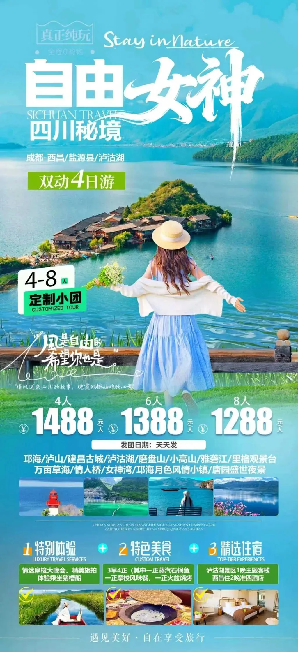 绵阳的小伙伴们看过来!绵阳 top10 旅行社 ——绵阳华阅国旅5 月限定新品线路正式上线✨【西昌泸沽湖・自由女神双动 4 日游】从绵阳出发,打卡四川秘境泸沽湖,邂逅西昌满城蓝花楹的限定浪漫!真正纯玩 0 购物,4-8 人定制小团,拒绝走马观花,自在享受旅行~