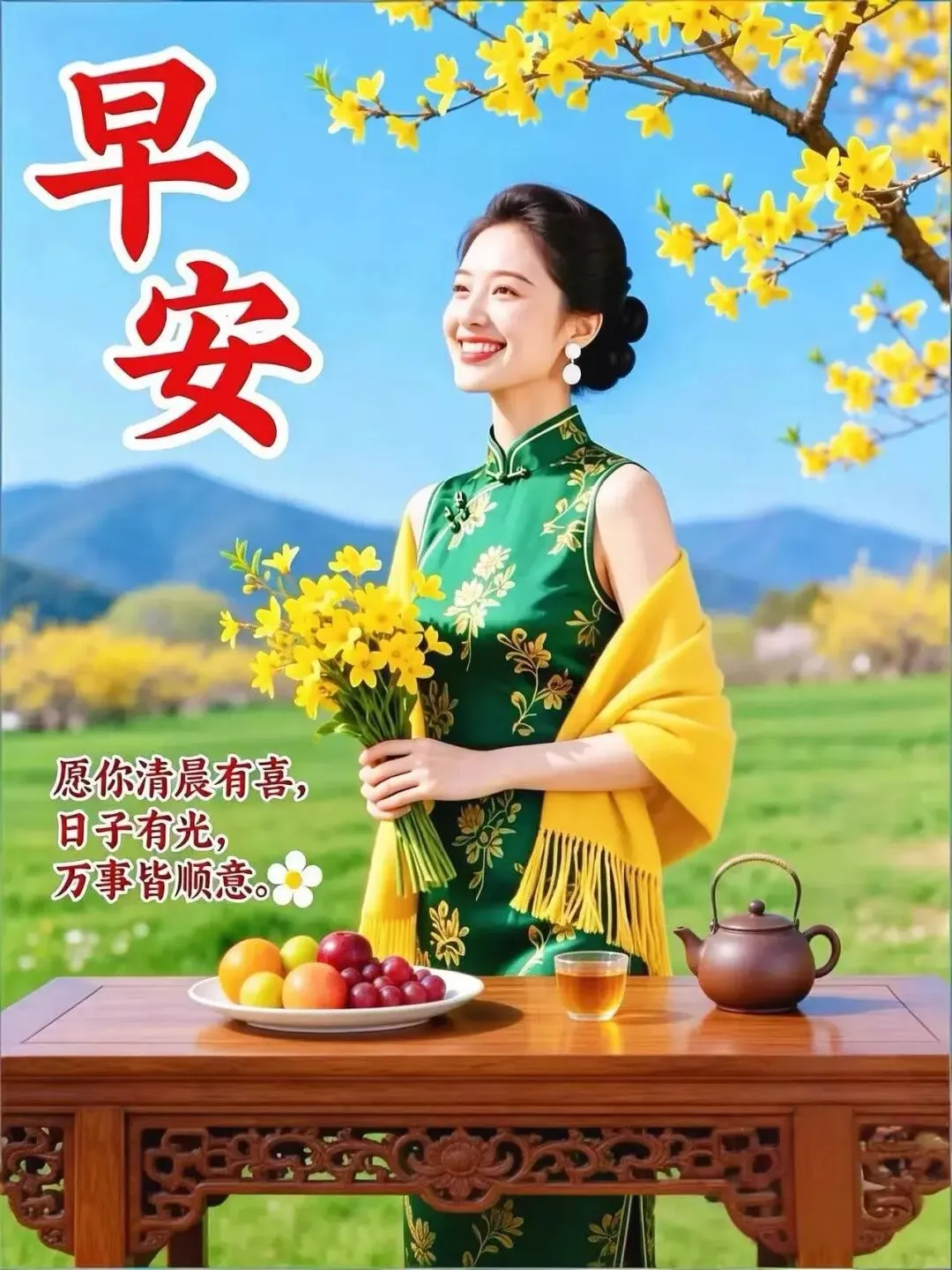 一杯春茶解烦忧,满目春色暖心房,健康常在身,平安常相伴。春风拂面来,时光缓缓行,珍惜每一份小美好。愿你日子清甜,事事顺心,岁岁皆安!🌹☕
